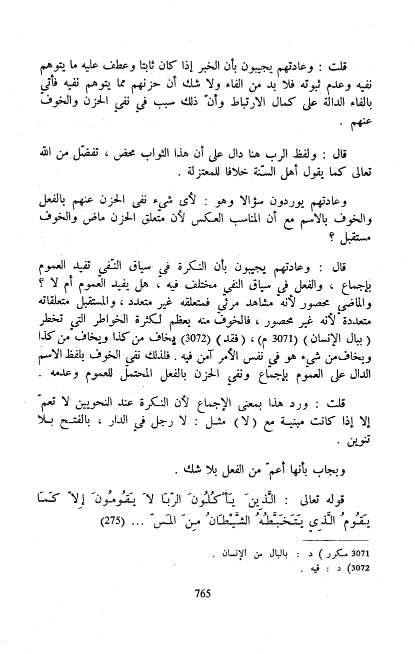قال: وعادتهم يجيبون بأن النكرة في سياق النّفي تفيد العموم بإجماع، والفعل في سياق النفي مختلف فيه، هل يفيد العموم أم لا؟ والماضي محصور لأنه مشاهد مرئي فمتعلقه غير متعدد، والمستقبل متعلقاته متعددة لأنه غير محصور، فالخوف منه يعظم لكثرة الخواطر التي تخطر (ببال الإنسان) ، (فقد) يخاف من كذا ويخاف من كذا ويخاف من شيء هو في نفس الأمر آمن فيه. فلذلك نفي الخوف بلفظ الاسم الدال على العموم بإجماع ونفي الحزن بالفعل المحتمل للعموم وعدمه.