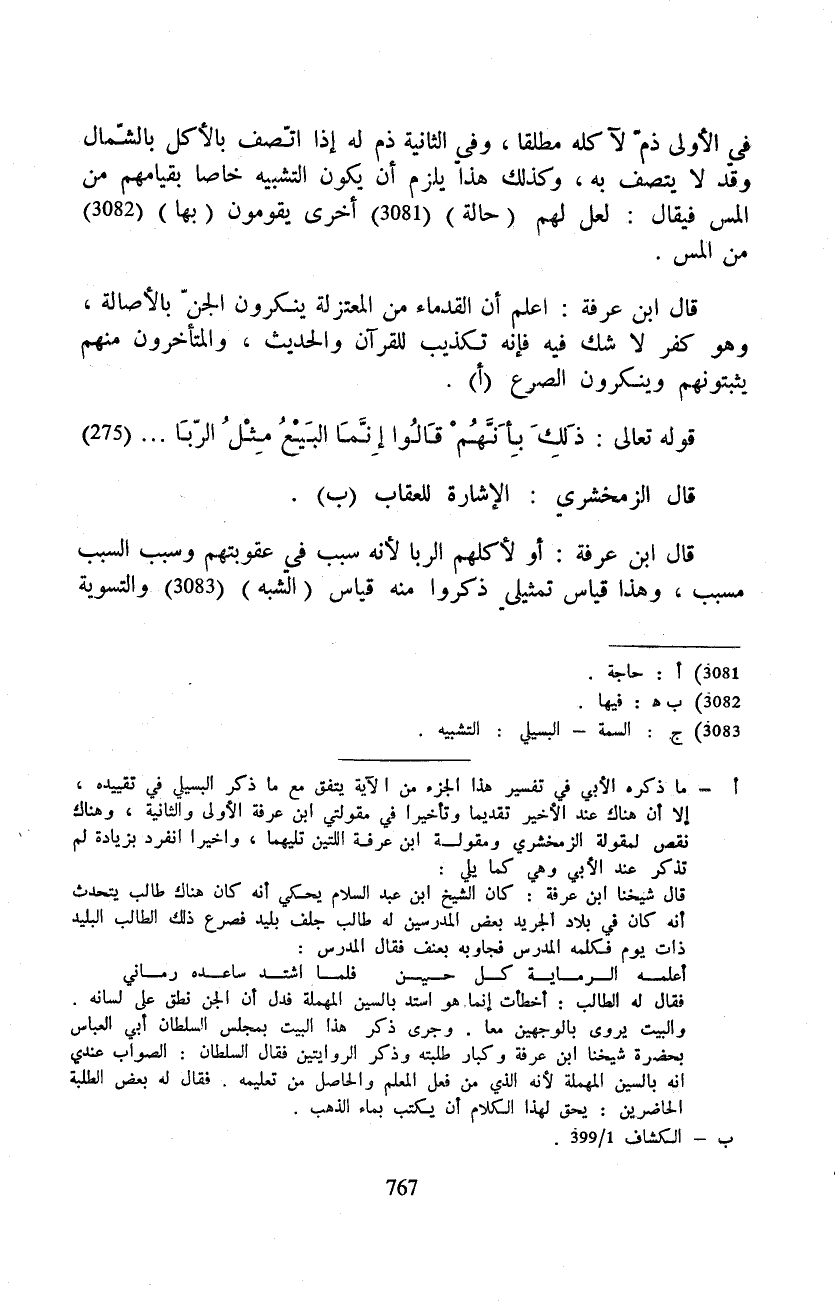 في الأولى ذمّ لآكله مطلقا، وفي الثانية ذم له إذا اتّصف بالأكل بالشّمال وقد لا يتصف به، وكذلك هذا يلزم أن يكون التشبيه خاصا بقيامهم من المس فيقال: لعل لهم (حالة) أخرى يقومون (بها) من المس.