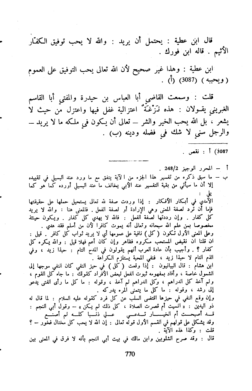 قلت: وسمعت القاضي أبا العباس بن حيدرة والمفتي أبا القاسم الغبريني يقولان: هذه نَزْغَةٌ اعتزالية غفل فيها واعتزل من حيث لا يشعر، بل الله يحب الخير والشر تعالى أن يكون في ملكه ما لا يريد والرجل سني لا شك في فضله ودينه.