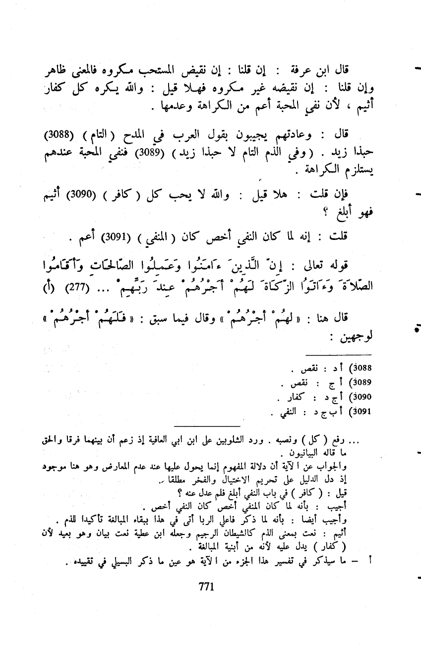 قال ابن عرفة: إن قلنا: إن نقيض المستحب مكروه فالمعنى ظاهر وإن قلنا: إن نقيضه غير مكروه فهلا قيل: والله يكره كل كفار أثيم، لأن نفي المحبة أعم من الكراهة وعدمها.