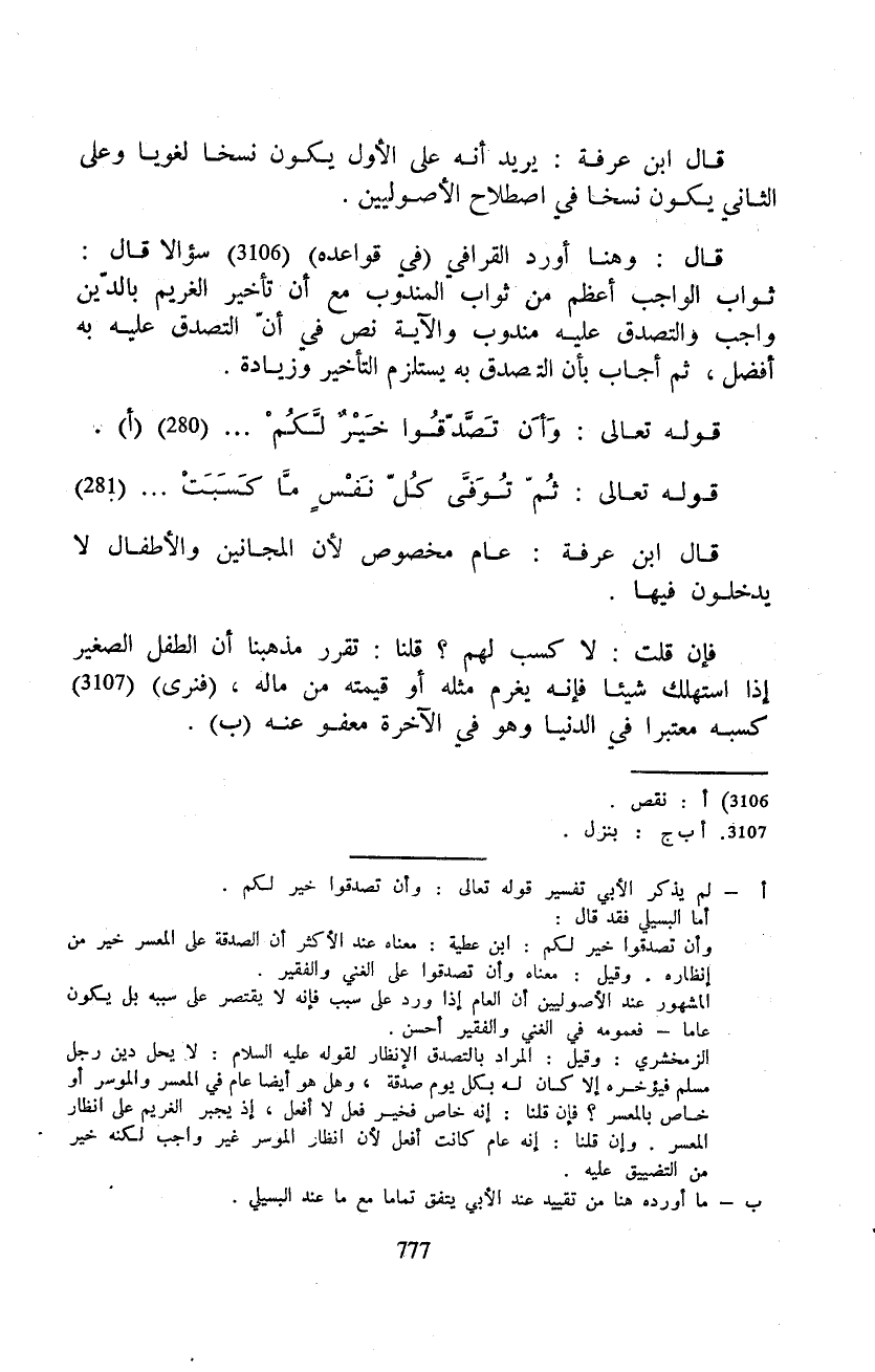 قال: وهنا أورد القرافي (في قواعده) سؤالا قال: ثواب الواجب أعظم من ثواب المندوب مع أن تأخير الغريم بالدّين واجب والتصدق عليه مندوب والآية نص في أنّ التصدق عليه بن أفضل، ثم أجاب التصدق به يستلزم التأخير وزيادة.