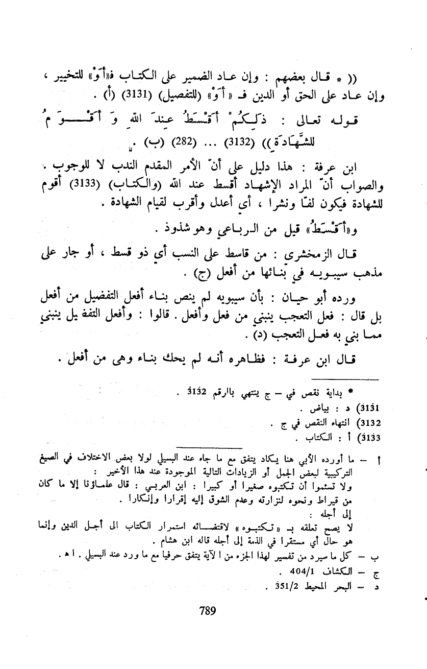 ابن عرفة: هذا دليل على أنّ الأمر المقدم الندب لا للوجوب. والصواب أنّ المراد الإشهاد أقسط عند الله (والكتاب) أقوم للشهادة فيكون لفّا ونشرا، أي أعدل وأقرب لقيام الشهادة.