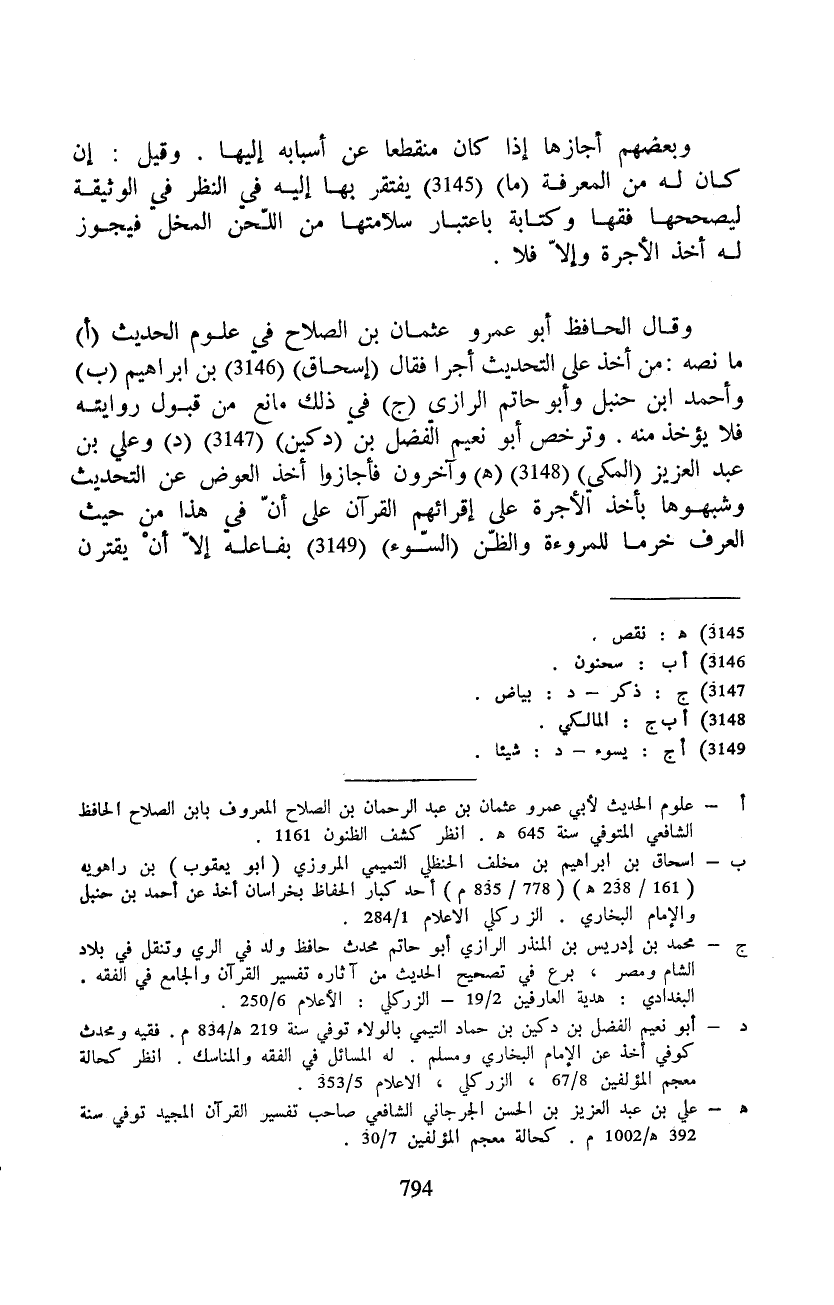 وقال الحافظ أبو عمرو عثمان بن الصلاح في علوم الحديث ما نصه: من أخذ على التحديث أجرا فقال (إسحاق) بن ابراهيم وأحمد ابن حنبل وأبو حاتم الرازي في ذلك مانع من قبول روايته فلا يؤخذ منه. وترخص أبو نعيم الفضل بن (دكين) وعلي بن عبد العزيز (المكي) وآخرون فأجازوا أخذ العوض عن التحديث وشبهوها بأخذ الأجرة على إقرائهم القرآن على أنّ في هذا من حيث العرف خرما للمروءة والظّن (السّوء) بفاعله إلاّ أنْ يقترن
