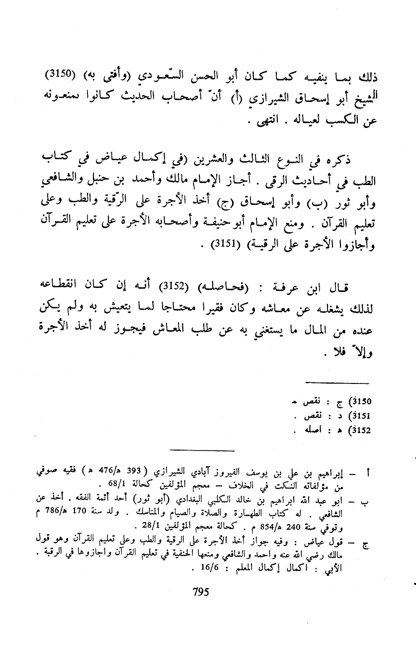 ذكره في النوع الثالث والعشرين (في إكمال عياض في كتاب الطب في أحاديث الرقى. أجاز الإمام مالك وأحمد بن حنبل والشافعي وأبو ثور وأبو إسحاق أخذ الأجرة على الرّقية والطب وعلى تعليم القرآن. ومنع الإمام أبو حنيفة وأصحابه الأجرة على تعليم القرآن وأجازوا الأجرة على الرقية) .