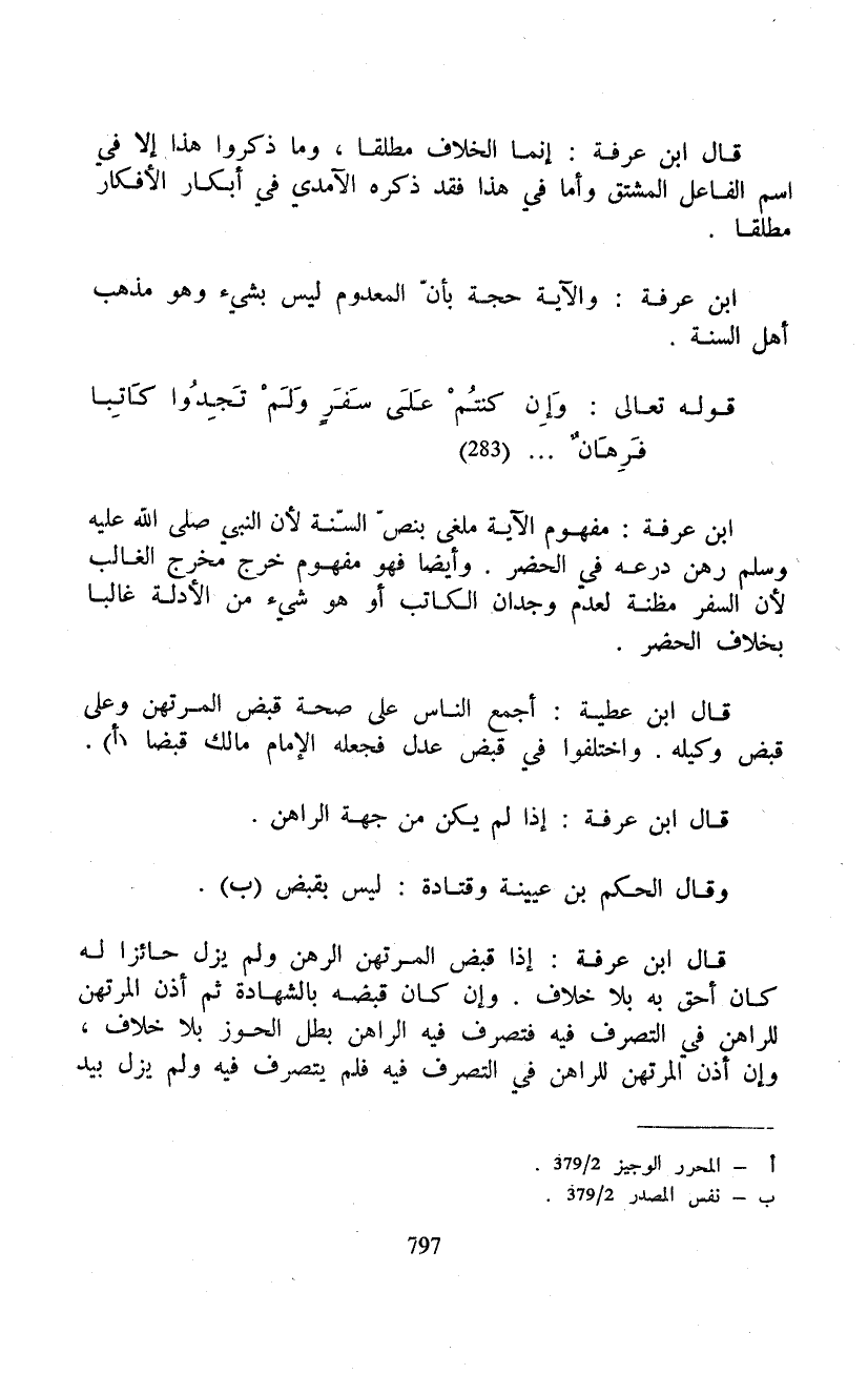 ابن عرفة: مفهوم الآية ملغى بنصّ السّنة لأن النبي صَلَّى اللَّهُ عَلَيْهِ وَسَلَّم َ رهن درعه في الحضر. وأيضا فهو مفهوم خرج مخرج الغالب لأن السفر مظنة لعدم وجدان الكاتب أو هو شيء من الأدلة غالبا بخلاف الحضر.