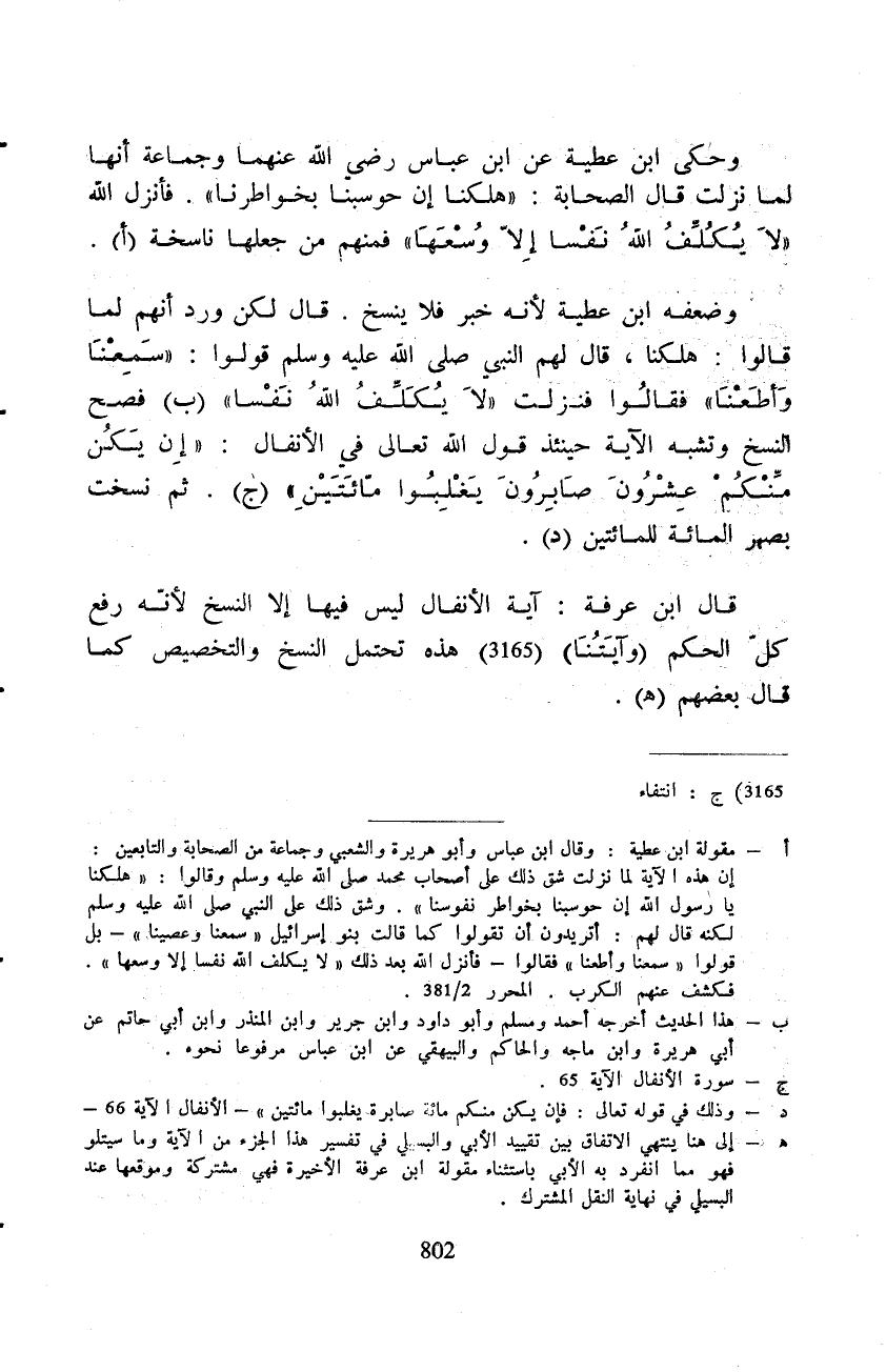 وضعفه ابن عطية لأنه خبر فلا ينسخ. قال لكن ورد أنهم لما قالوا: هلكنا، قال لهم النبي صَلَّى اللَّهُ عَلَيْهِ وَسَلَّم َ قولوا: «سَمِعْنَا وَأَطَعْنَا» فقالُوا فنزلت {لاَ يُكَلِّفُ الله نَفْساً} فصح النسخ وتشبه الآية حيئنذ قول الله تعالى في الأنفال: {إِن يَكُن مِّنكُمْ عِشْرُونَ صَابِرُونَ يَغْلِبُواْ مِاْئَتَيْنِ} ثم نسخت بصبر المائة للمائتين.