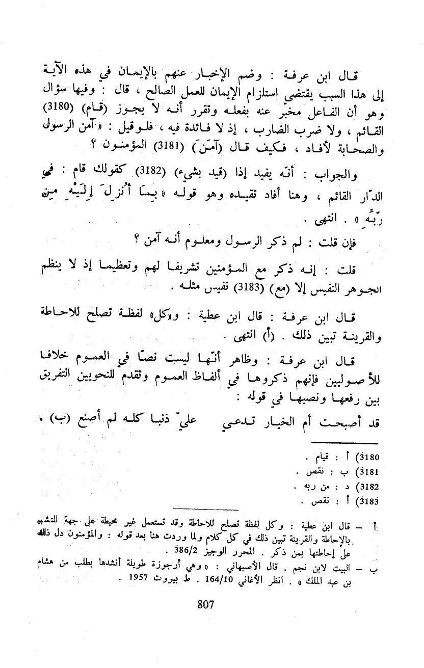 قال ابن عرفة: وظاهر أنّها ليست نصّا في العموم خلافا للأصوليين فإنهم ذكروها في ألفاظ العموم وتقدم للنحويين التفريق بين رفعها ونصبها في قوله:
