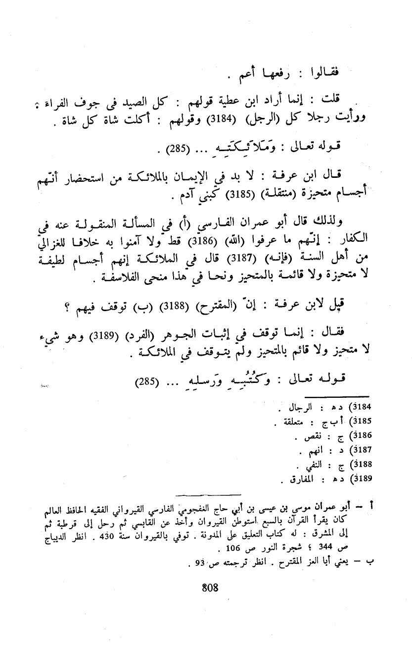 ولذلك قال أبو عمران الفارسي في المسألة المنقولة عنه في الكفار: إنّهم ما عرفوا (الله) قط ولا آمنوا به خلافا للغزالي من أهل السنة (فإنه) قال في الملائكة إنهم أجسام لطيفة لا متحيزة ولا قائمة بالمتحيز ونحا في هذا منحى الفلاسفة.