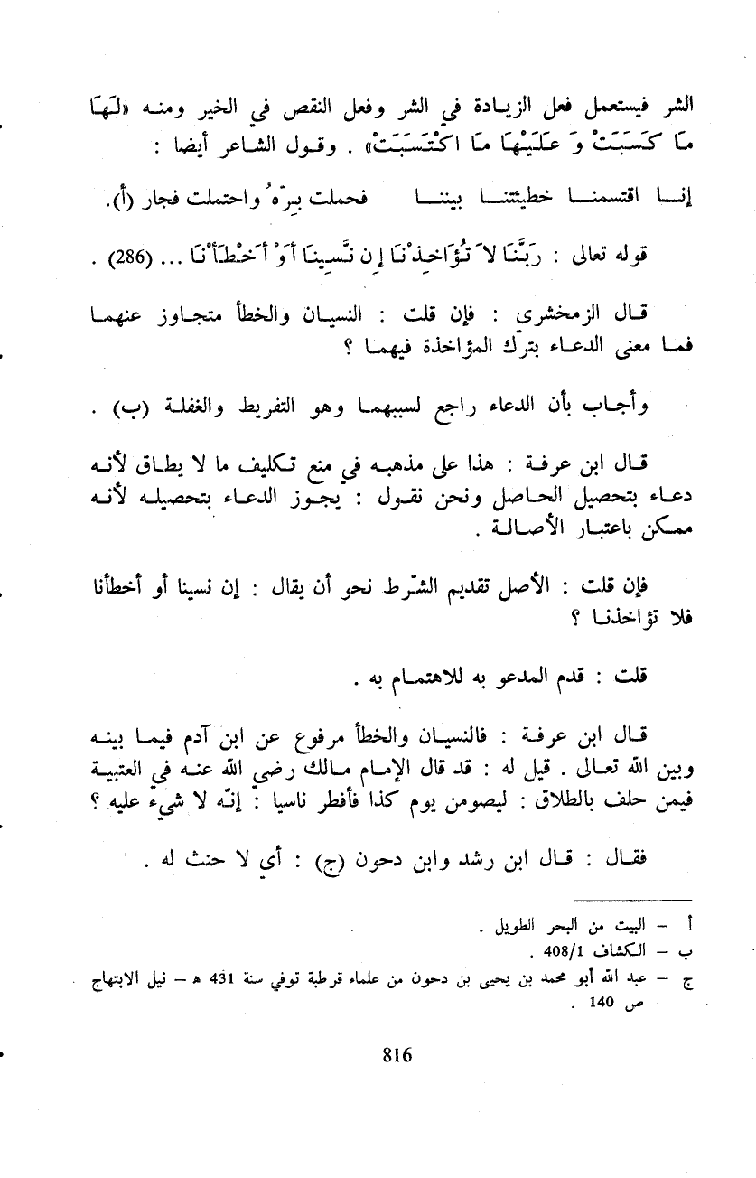 قال ابن عرفة: فالنسيان والخطأ مرفوع عن ابن آدم فيما بينه وبين الله تعالى. قيل له: قد قال الإمام مالك رَضِيَ اللَّهُ عَنْه في العتبية فيمن حلف بالطلاق: ليصومن يوم كذا فأفطر ناسيا: إنّه لا شيء عليه؟