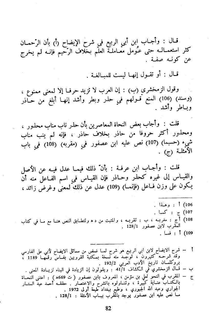 قلت: وأجاب ابن عرفة: بأنّ ذلك فيما عدل فيه عن الأصل والقياس إلى غيره كحذر وحاذر فإن القياس في اسم الفاعل منه أن يكون على وزن فاعل (فإنما) عدل عن ذلك لمعنى وغرض زائد،