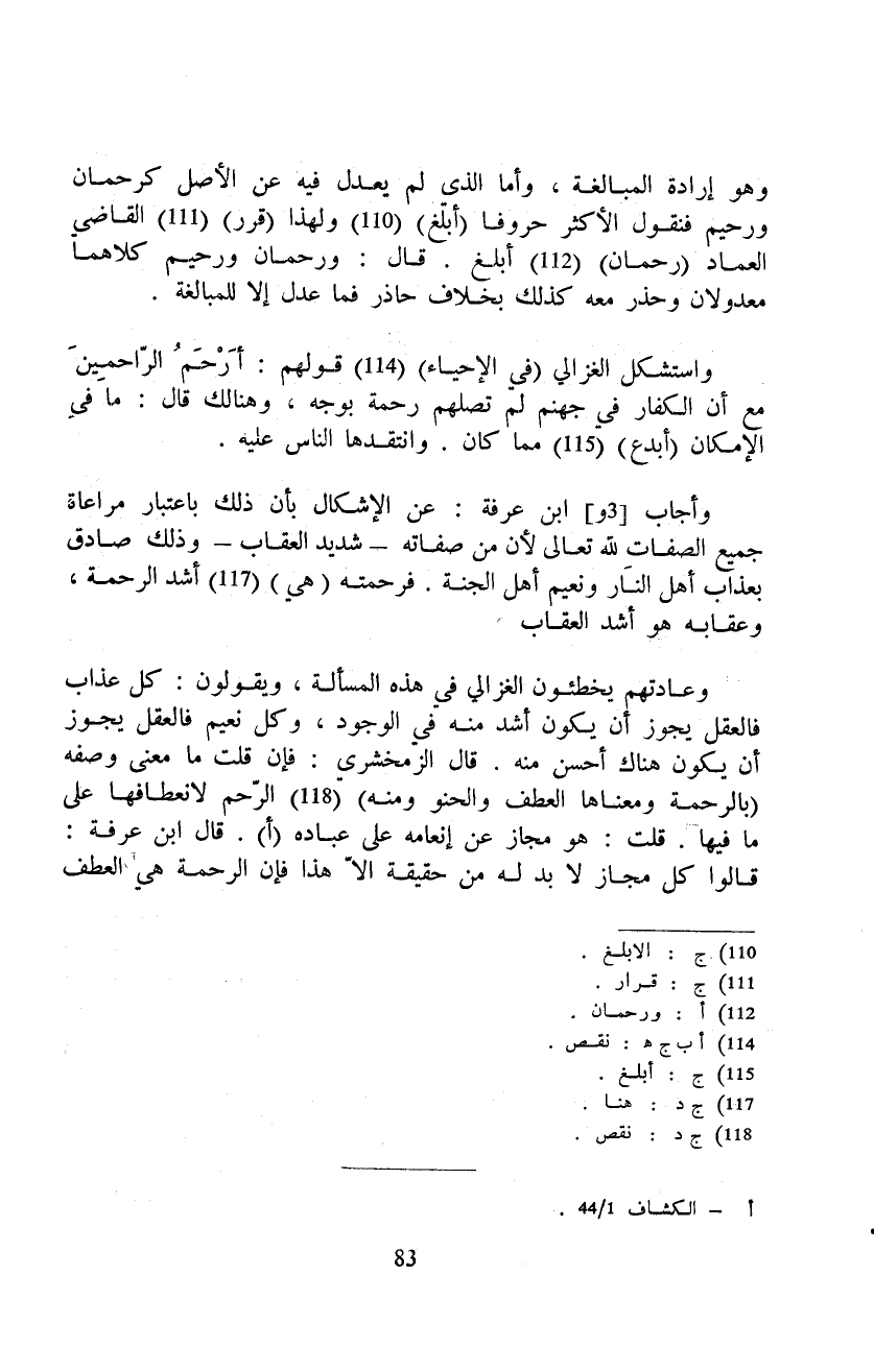واستشكل الغزالي (في الإحياء) قولهم: أَرْحَمُ الرّاحمِينَ مع أن الكفار في جهنم لم تصلهم رحمة بوجه، وهنالك قال: ما في الإمكان (أبدع) مما كان. وانتقدها الناس عليه.