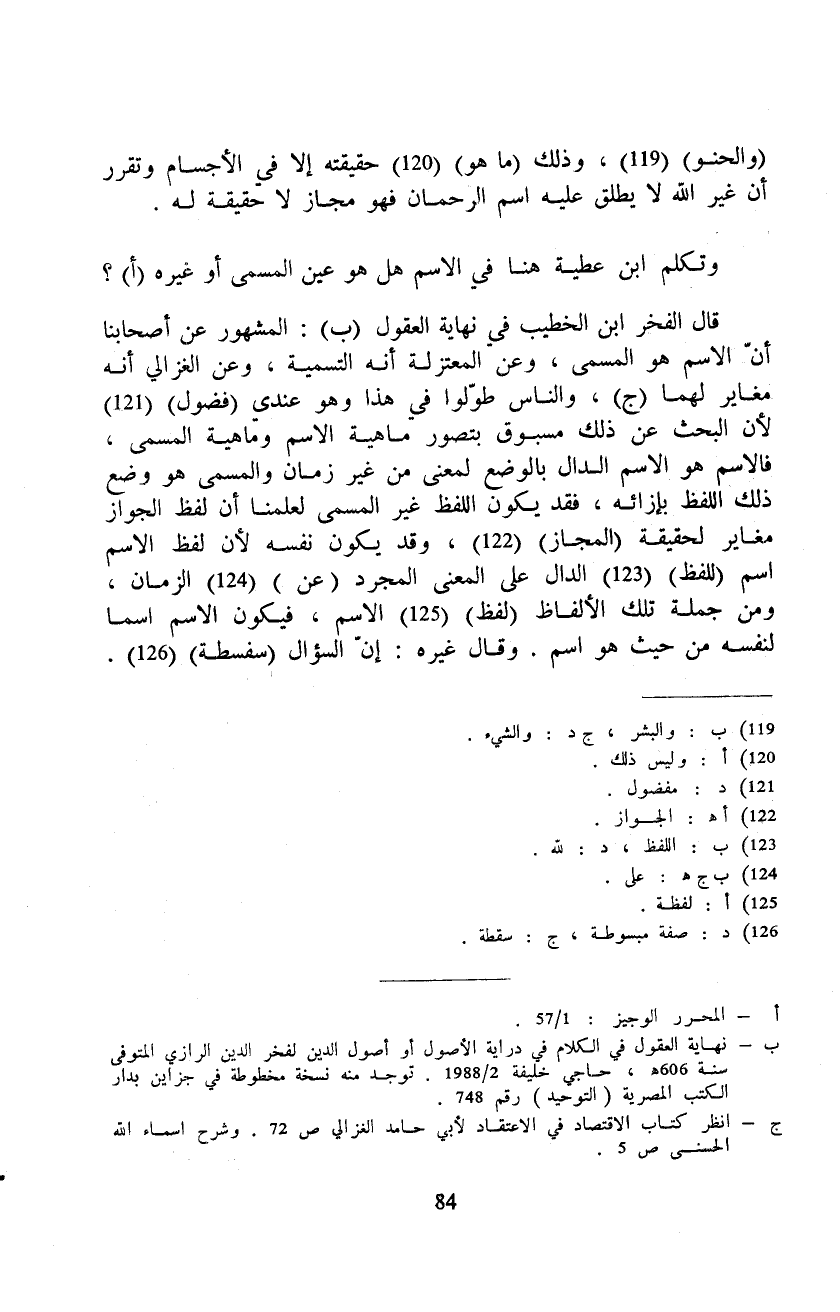 قال الفخر ابن الخطيب في نهاية العقول: المشهور عن أصحابنا أنّ الاسم هو المسمى، وعن المعتزلة أنه التسمية، وعن الغزالي أنه مغاير لهما، والناس طوّلوا في هذا وهو عندي (فضول) لأن البحث عن ذلك مسبوق بتصور ماهية الاسم وماهية المسمى، فالاسم هو الاسم الدال بالوضع لمعنى من غير زمان والمسمى هو وضع ذلك اللفظ بإزائه، فقد يكون اللفظ غير المسمى لعلمنا أن لفظ الجواز مغاير لحقيقة (المجاز) ، وقد يكون نفسه لأن لفظ الاسم اسم (للفظ) الدال على المعنى المجرد (عن) الزمان، ومن جملة تلك الألفاظ (لفظ) الاسم، فيكون الاسم اسما لنفسه من حيث هو اسم. وقال غيره: إنّ السؤال (سفسطة) .