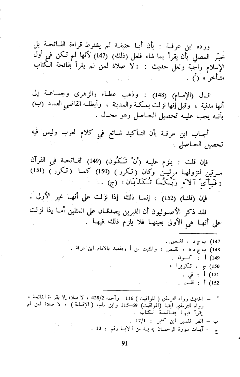 ورده ابن عرفة: بأن أبا حنيفة لم يشترط قراءة الفاتحة بل خيّر المصلي بأن يقرأ بما شاء فلعل (ذلك) لأنها لم تكن في أول الإسلام واجبة ولعل حديث: " لا صلاة لمن يقرأ بفاتحة الكتاب متأخر ". قال (الإمام) : وذهب عطاء والزهري وجماعة إلى أنها مدينة، وقيل أنها نزنلت بمكة والمدينة، وأبطله القاضي العماد بأنه يجب عليه تحصيل الحاصل وهو محال. أجاب ابن عرفة بأن التأكيد شائع في كلام العرب وليس فيه تحصيل الحاصل. فإن قلت: يلزم عليه (أنْ تَكُون) الفاتحة في القرآن مرتين لتزولها مرتين وكان (تكرر) كما (تكرر) {فَبِأَيّ آلاَءِ رَبِّكُمَا تُكَذّبَان} . فإن قلنا: إنما ذلك إذا نزلت على أنها غير الأولى. فقد ذكر الأصوليون أن الغيرين يصدقان على المثلين أما إذا نزلت على أنها الأولى بعينها فلا يلزم ذلك فيها.