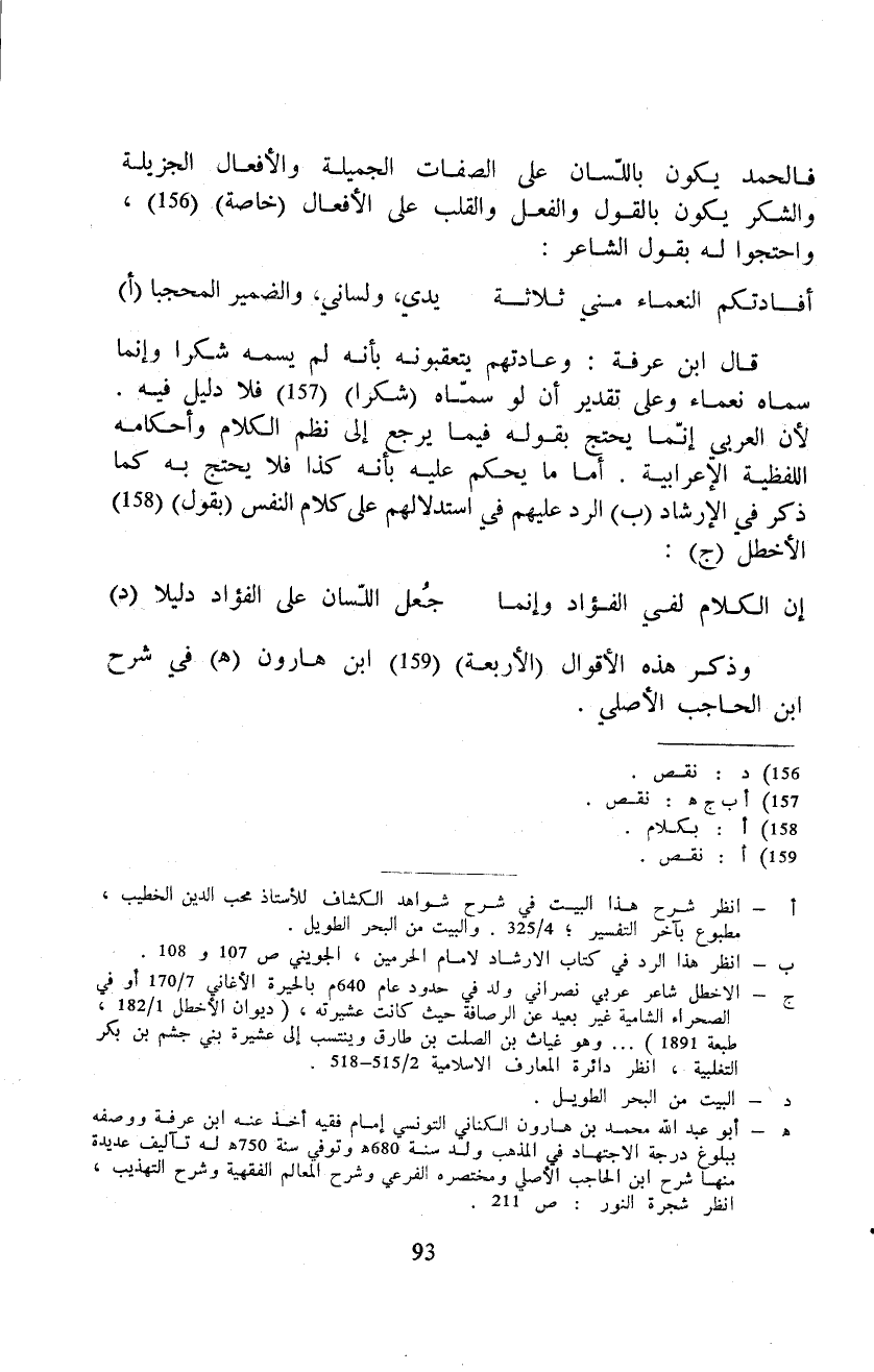 قال ابن عرفة: وعادتهم يتعقبونه بانه لم يسمه شكرا وإنما سماه نعماء وعلى تقدير أن لو سمّاه (شكرا) فلا دليل فيه. لأن العربي إنّما يحتج بقوله فيما يرجع إلى نظم الكلام وأحكامه اللفظية الإعرابية. أما ما يحكم عليه بأنه كذا فلا يحتج به كما ذكر في الإرشاد الرد عليهم في استدلالهم على كلام النفس (بقول) الأخطل:
