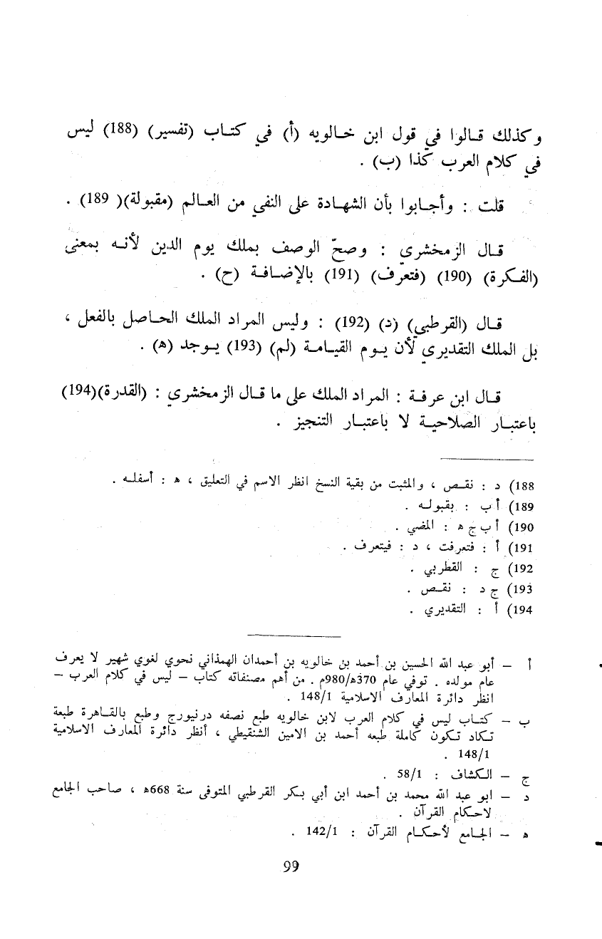وكذلك قالوا في قول ابن خالويه في كتاب (تفسير) ليس في كلام العرب كذا.