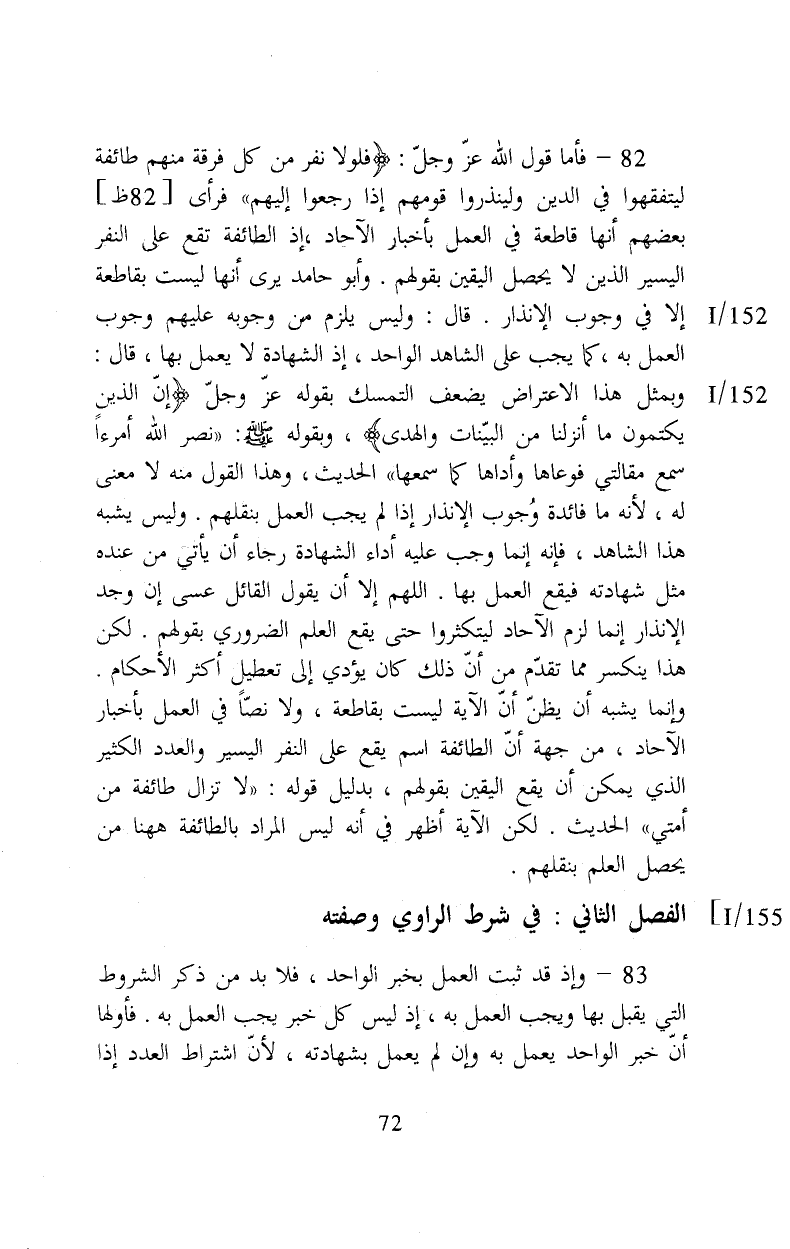 ٨٢- فأما قول الله عزوجل: {فَلَوْلا نَفَرَ مِنْ كُلِّ فِرْقَةٍ مِنْهُمْ طَائِفَةٌ لِيَتَفَقَّهُوا فِي الدِّينِ وَلِيُنْذِرُوا قَوْمَهُمْ إِذَا رَجَعُوا إِلَيْهِم) (التوبة: من الآية١٢٢) فرأى بعضهم أنها قاطعة في العمل بأخبار الآحاد إذ طائفة تقع على النفر اليسير الذين لا يحصل اليقين بقولهم وأبو حامد يرى أنها ليست بقاطعة إلا في وجوب الإنذار قال: وليس يلزم من وجوبه عليهم وجوب العمل به كما يجب على الشاهد الواحد إذ الشهادة لا يعمل بها وقال وبمثل هذا الاعتراض يضعف التمسك بقوله عز وجل {إن الذين يكتمون ما أنزلنا من البينات والهدى} وبقوله) : - صلى الله عليه وسلم - نضر الله أمرءا سمع مقالتي فوعاها وأداها كما سمعها) الحديث، وهذا القول منه لا معنى له لأنه ما فائدة وجوب الإنذار إذا لم يجب العمل بنقلهم وليس يشبه هذا الشاهد فإنه إنما وجب عليه أداء الشهادة رجاء أن يأتي من عنده مثل شهادته فيقع العمل بها. اللهم إلا أن يقول القائل عسى إن وجد الإنذار إنما لزم الآحاد ليتكثروا حتى يقع العلم الضروري بقولهم لكن هذا ينكسر مما تقدم من أن ذلك كان يؤدي إلى تعطيل أكثر الأحكام وإنما يشبه أن يظن أن الآية ليست بقاطعة ولا نصا في العمل بأخبار الآحاد من جهة أن الطائفة اسم يقع على النفر اليسير والعدد الكثير الذي يمكن أن يقع على اليقين بقولهم بدليل قوله (لا تزال طائفة من أمتي) الحديث. لكن الآية أظهر في أنه ليس المراد بالطائفة ههنا من يحصل العلم بنقلهم.
