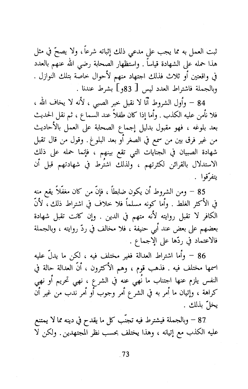 ٨٦-وأما اشتراط العدالة فغير مختلف فيه, لكن ما يدل عليه اسمها مختلف فيه فذهب قوم وهم الأكثرون أن العدالة حالة في النفس يلزم عنها اجتناب ما نهي عنه في الشرع نهي تحريم أو نهي كراهة وإتيان ما أمر به في الشرع أمر وجوب أو أمر ندب من غير أن يخل بذلك.