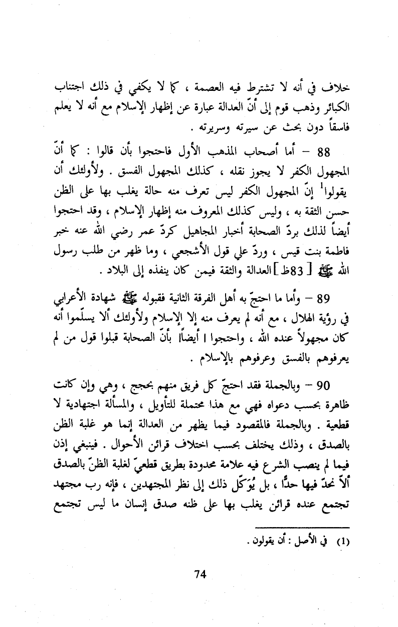 ٩٠ وبالجملة فقد احتج كل فريق منهم بحجج، وهي وإن كانت ظاهرة بحسب دعواه فهي مع هذا محتملة للتأويل والمسألة اجتهادية لا قطعية. وبالجملة فالمقصود فيما يظهر من العدالة إنما هو غلبة الظن بالصدق وذلك يختلف بحسب اختلا ف قرائن الأحوال. فينبغي إذن فيما لم ينصب الشرع فيه علامة محدودة بطريق قطعي لغلبة الظن بالصدق ألا نحد فيها حدا بل يوكل ذلك إلى نظر المجتهدين، فإنه رب مجتهد تجتمع عنده قرائن يغلب بها على ظنه صدق إنسان ما ليس تجتمع