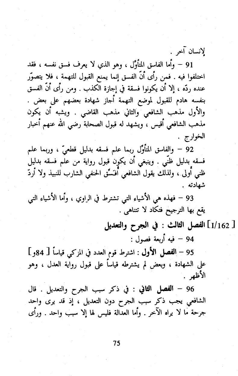 ٩٦ الفصل الثاني: في ذكر سبب الجرح والتعديل. قال الشافعي يجب ذكر سبب الجرح دون التعديل. إذ قد يرى واحد جرحة ما لا يراه الآخر. وأما العدالة فليس لها إلا سبب واحد. ورأى