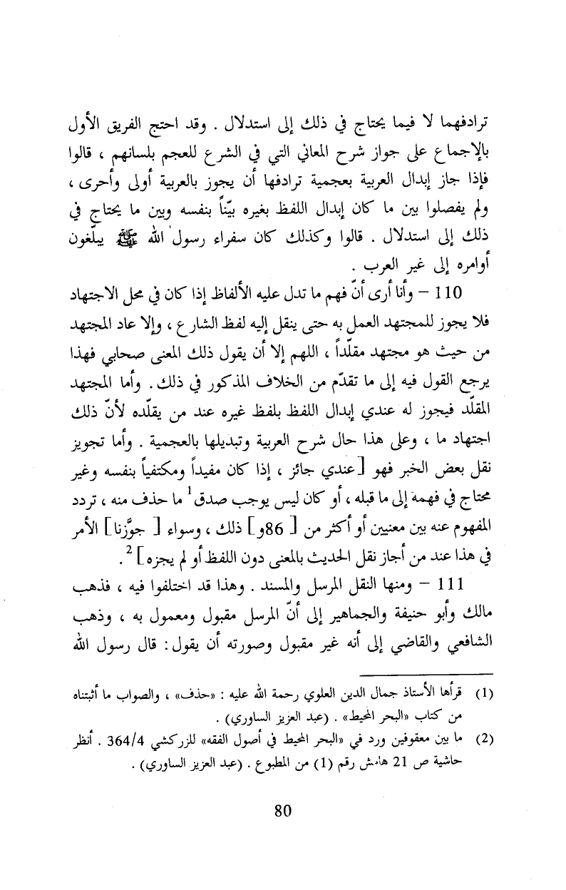 ١١٠- وأنا أرى أن فهم ما تدل عليه الألفاظ إذا كان في محل الاجتهاد فلا يجوز للمجتهد العمل به حتى ينقل إليه لفظ الشارع , وإلا عاد المجتهد من حيث هو مجتهد مقلدا , اللهم إلا أن يقول ذلك المعنى صحابي فهذا يرجع القول فيه إلى ما تقدم من الخلاف المذكور في ذلك. وأما المجتهد المقلد فيجوز له عندي إبدال اللفظ بلفظ غيره عند من يقلده لأن ذلك اجتهاد ما , وعلى هذا حال شرح العربية وتبديلها بالعجمية. وأما تجويز نقل بعض الخبر فهو [عندي جائز , إذا كان مفيدا ومكتفيا بنفسه وغير محتاج في فهمه إلى ما قبله , أو كان ليس يوجب صدق (١) ما حذف منه , تردد المفهوم عنه بين معنيين أو أكثر من ذلك , وسواء [جوزنا] الأمر في هذا عند من أجاز نقل الحديث بالمعنى دون اللفظ أو لم يجزه] (٢) .