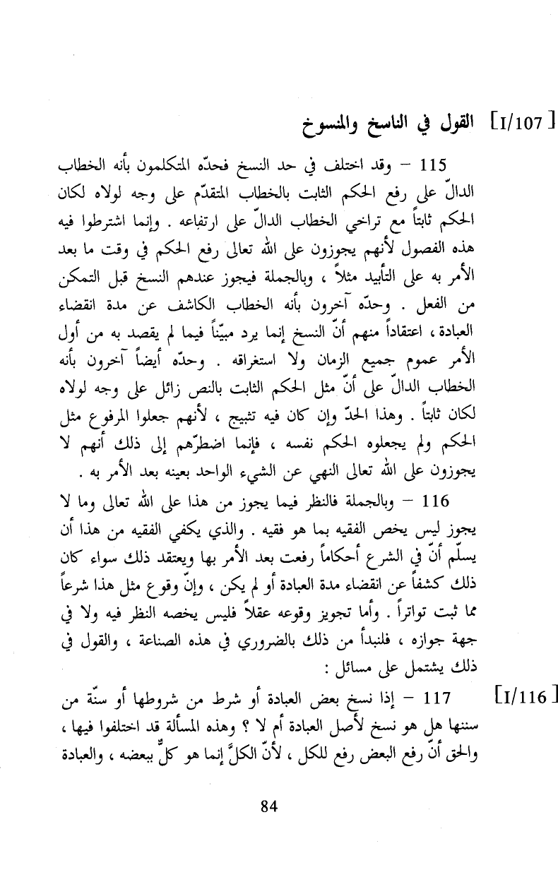 ١١٥- وقد اختلف في حد النسخ فحده المتكلمون بأنه الخطاب الدال على رفع الحكم الثابت بالخطاب المتقدم على وجه لولاه لكان الحكم ثابتا مع تراخي الخطاب الدال على ارتفاعه. وإنما اشترطوا فيه هذه الفصول لأنهم يجوزون على الله تعالى رفع الحكم في وقت ما بعد الأمر به على التأبيد مثلا , وبالجملة فيجوز عندهم النسخ قبل التمكن من الفعل. وحده آخرون بأنه الخطاب الكاشف عن مدة انقضاء العبادة , اعتقادا منهم أن النسخ إنما يرد مبينا فيما لم يقصد به من أول الأمر عموم جميع الزمان ولا استغراقه. وحده أيضا آخرون بأنه الخطاب الدال على أن مثل الحكم الثابت بالنص زائل على وجه لولاه لكان ثابتا. وهذا الحد وإن كان فيه تثبيج , لأنهم جعلوا المرفوع مثل الحكم ولم يجعلوه الحكم نفسه , فإنما اضطرهم إلى ذلك أنهم لا يجوزون على الله تعالى النهي عن الشيء الواحد بعينه بعد الأمر به.