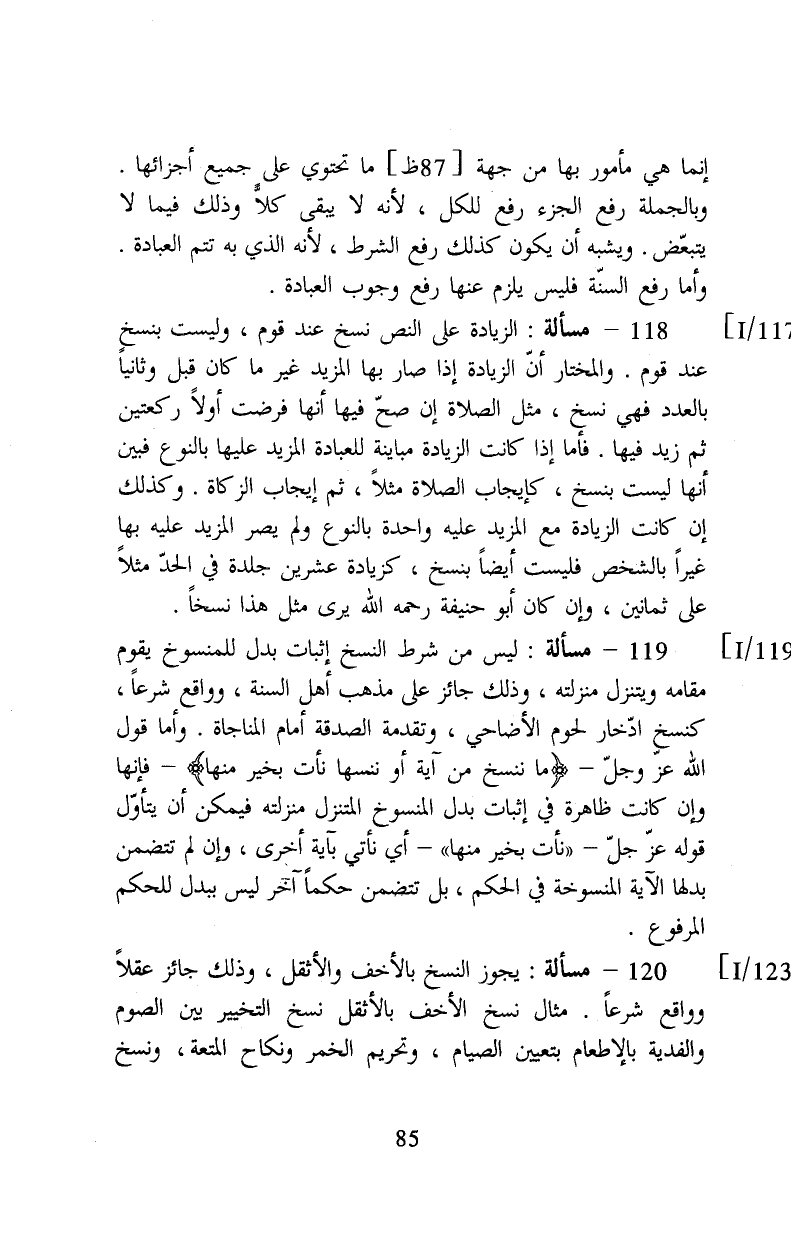 ١١٨-مسألة: الزيادة على النص نسخ عند قوم, وليست بنسخ عند القوم. والمختار أن الزيادة إذا صار بها المزيد غير ما كان قبل وثانيا بالعدد فهي نسخ, مثل الصلاة إن صح فيها أنها فرضت أولا ركعتين ثم زيد فيها. فأما إذا كانت الزيادة مباينة للعبادة المزيد عليها بالنوع فبين أنها ليست بنسخ, كإيجاب الصلاة مثلا, ثم إيجاب الزكاة. وكذلك إن كانت الزيادة مع المزيد عليه واحدة بالنوع ولم يصر المزيد عليه بها غيرا بالشخص فليست أيضا بنسخ, كزيادة عشرين جلدة في الحد مثلا على ثمانين, وإن كان أبو حنيفة رحمه الله يرى مثل هذا نسخا.