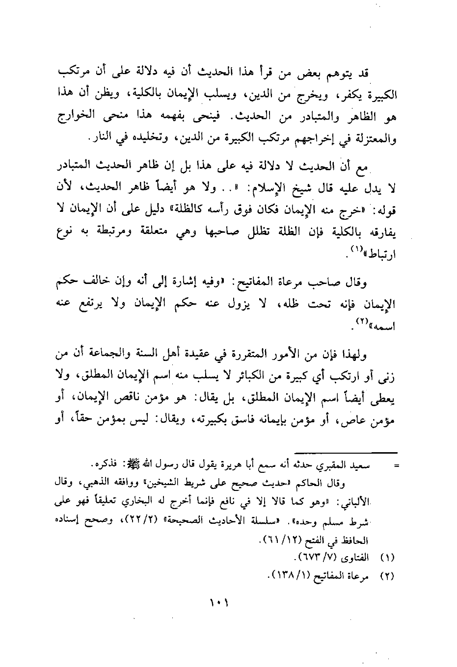 قد يتوهم بعض من قرأ هذا الحديث أن فيه دلالة على أن مرتكب الكبيرة يكفر، ويخرج من الدين، ويسلب الإيمان بالكلية، ويظن أن هذا هو الظاهر والمتبادر من الحديث. فينحى بفهمه هذا منحى الخوارج والمعتزلة في إخراجهم مرتكب الكبيرة من الدين، وتخليده في النار.
