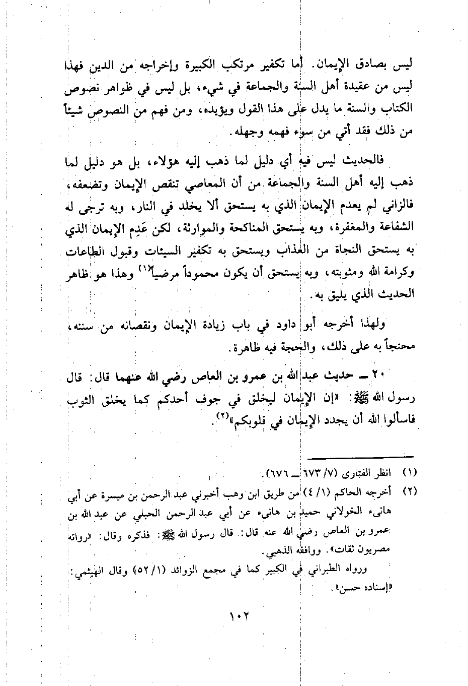 20- حديث عبد الله بن عمرو بن العاص رضي الله عنهما قال؟ قال رسول الله صلى الله عليه وسلم:"إن الإيمان ليخلق في جوف أحدكم كما يخلق الثوب فاسألوا الله أن يجدد الإيمان في قلوبكم" 2.