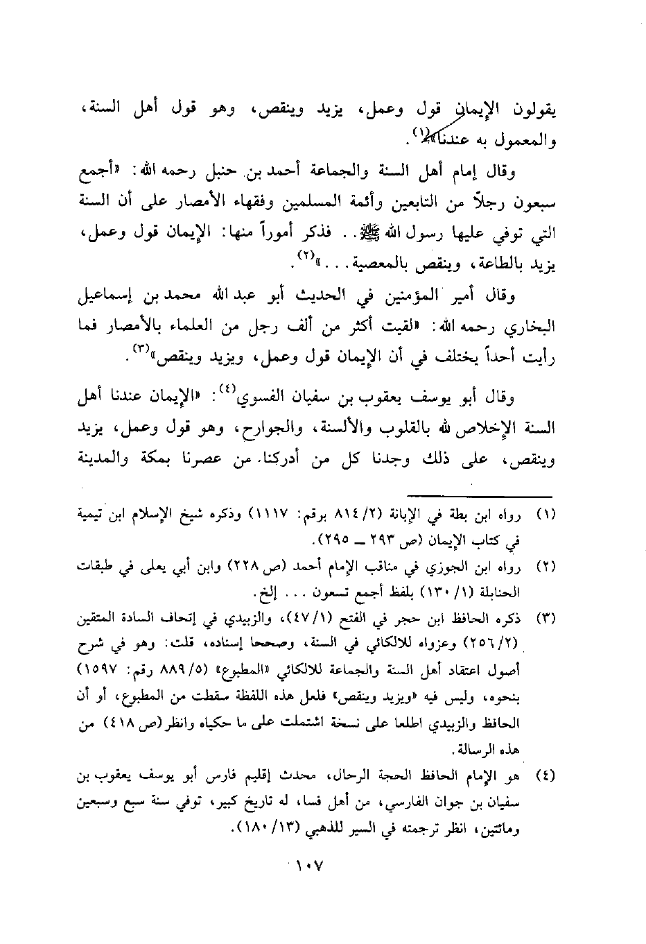 3 ذكره الحافظ ابن حجر في الفتح (1/ 47) ، والزبيدي في إتحاف السادة المتقين (2/ 256) وعزواه للالكائي في السنة، وصححا إسناده، قلت: وهو في شرح أصول اعتقاد أهل السنة والجماعة للالكائي"المطبوع" (5/ 889 رقم:1597) بنحوه، وليس فيه"ويزيد وينقص، فلعل هذه اللفظة سقطت من المطبوع، أو أن الحافظ والزبيدي اطلعا على نسخة اشتملت على ما حكياه. وانظر (ص 418) من هذه الرسالة.