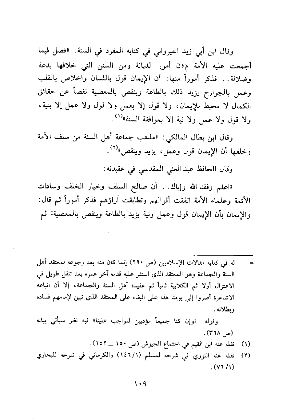 وقال الحافظ عبد الغني المقدسي في عقيدته:"اعلم وفقنا الله وإياك.. أن صالح السلف وخيار الخلف وسادات الأئمة وعلماء الأمة اتفقت أقوالهم وتطابقت آراؤهم فذكر أموراً ثم قال: والإيمان بأن الإيمان قول وعمل ونية يزيد بالطاعة وينقص بالمعصية"ثم