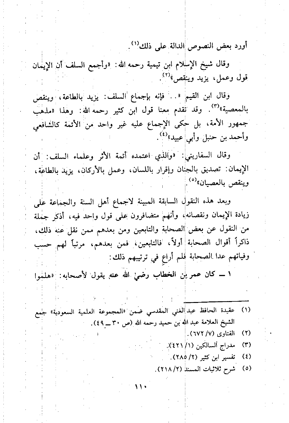 وقال شيخ الإسلام ابن تيمية رحمه الله:"وأجمع السلف أن الإيمان قول وعمل، يزيد وينقص"2.