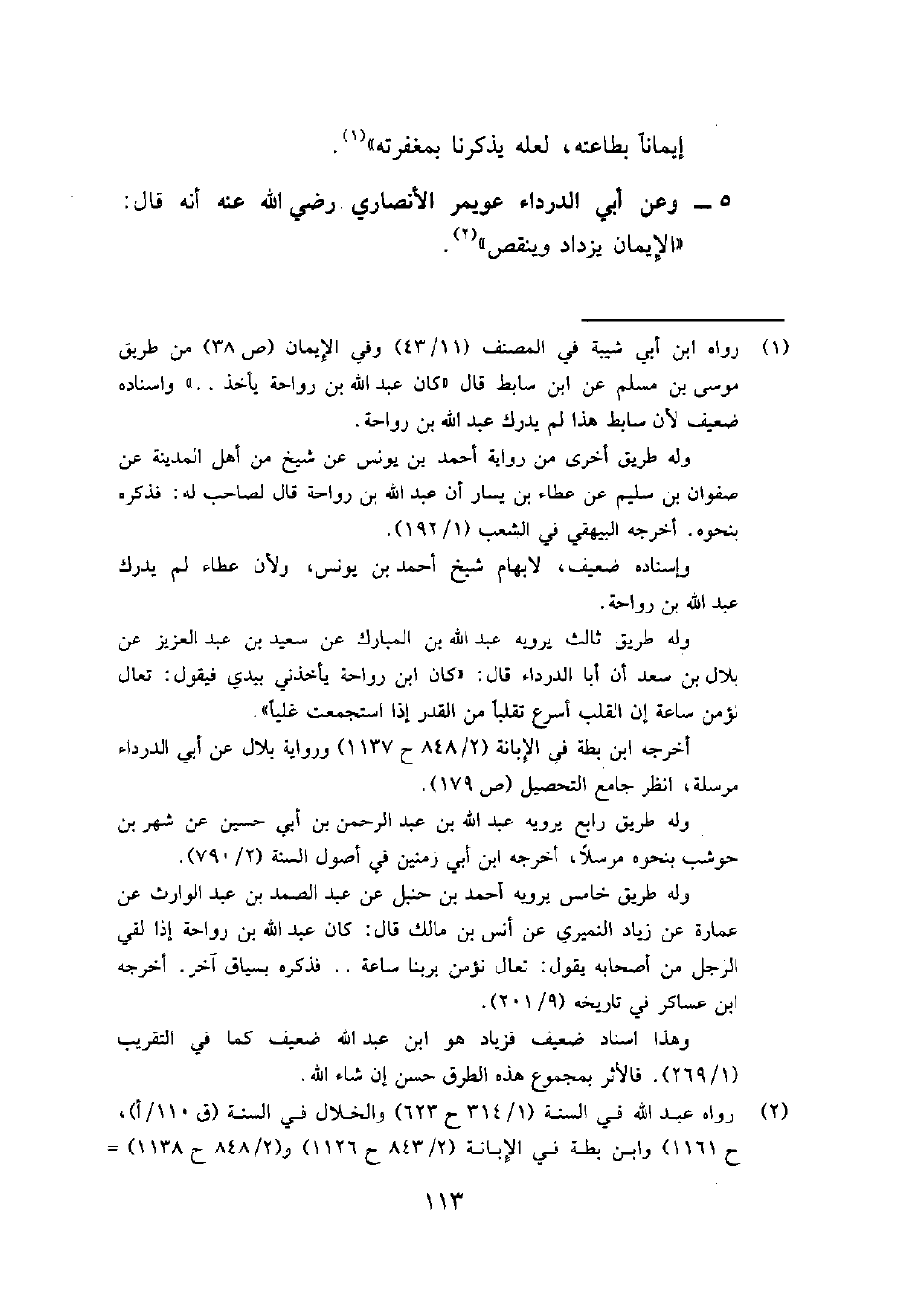 5- وعن أبي الدرداء عويمر الأنصاري رضي الله عنه أنه قال:"الإيمان يزداد وينقص"2.