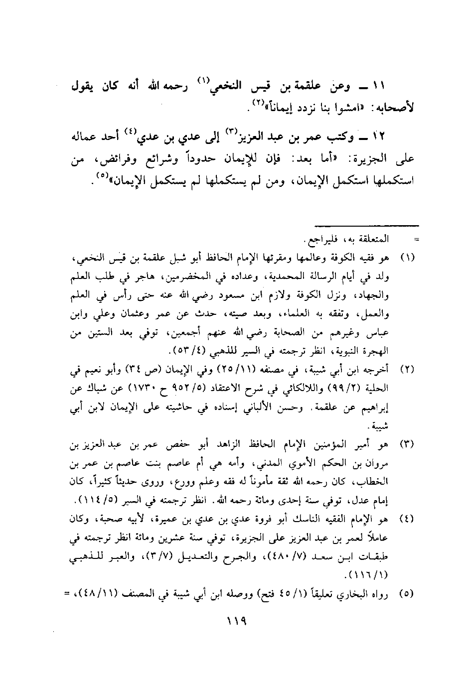 2 أخرجه ابن أبي شيبة، في مصنفه (11/ 25) وفي الإيمان (ص 34) وأبو نعيم في الحلية (2/ 99) واللالكائي في شرح الاعتقاد (5/ 952 ح1730) عن شباك عن إبراهيم عن علقمة. وحسن الألباني إسناده في حاشيته على الإيمان لابن أبي شيبة.