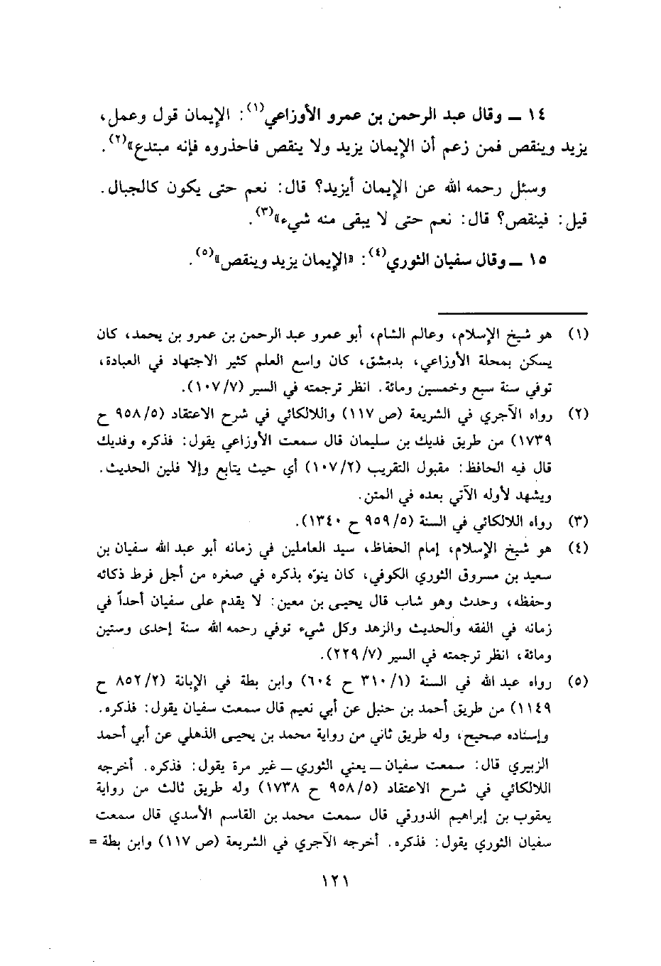 14- وقال عبد الرحمن بن عمرو الأوزاعي1: الإيمان قول وعمل، يزيد وينقص فمن زعم أن الإيمان يزيد ولا ينقص فاحذروه فإنه مبتدع"2.