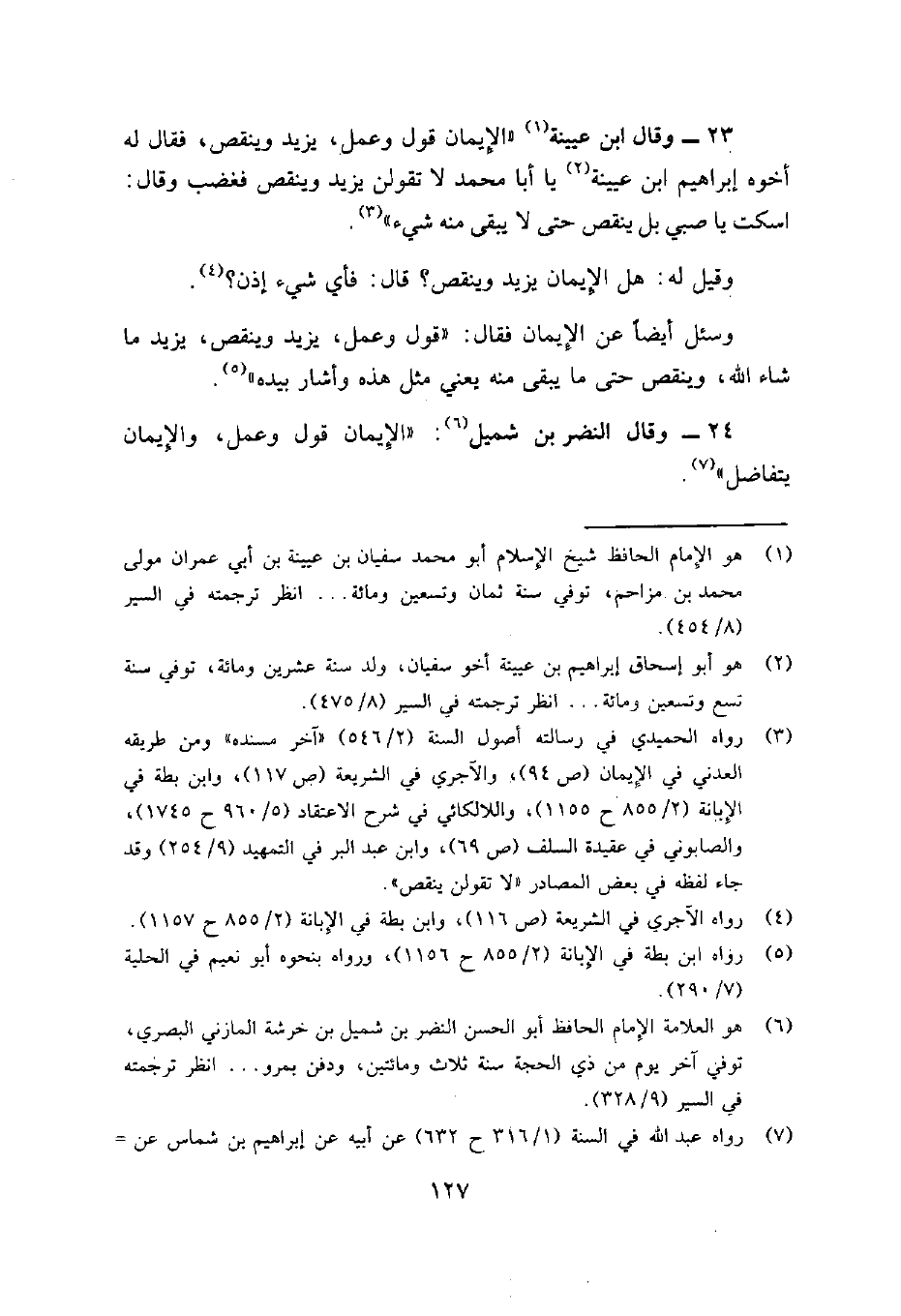 24- وقال النضر بن شميل6:"الإيمان قول وعمل، والإيمان يتفاضل"7.