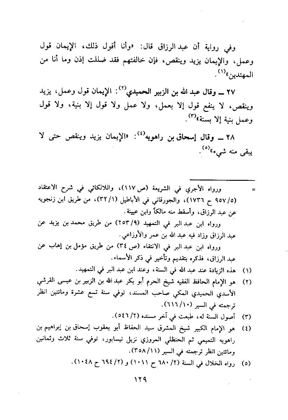 28- وقال إسحاق بن راهويه4:"الإيمان يزيد وينقص حتى لا يبقى منه شيء"5.