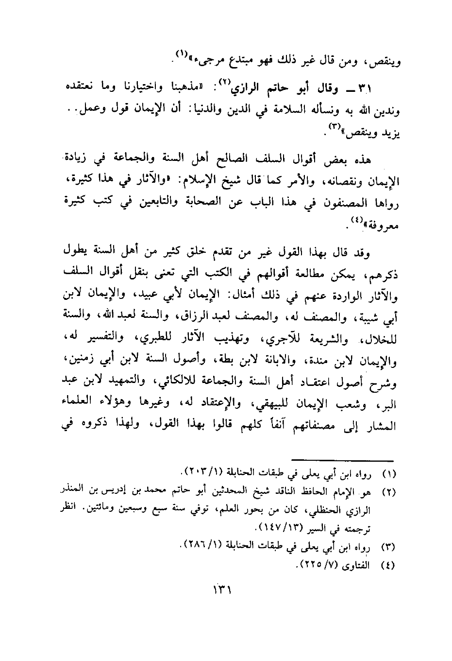 31- وقال أبو حاتم الرازي2:"مذهبنا واختيارنا وما نعتقده وندين الله به ونسأله السلامة في الدين والدنيا: أن الإيمان قول وعمل.. يزيد وينقص"3.