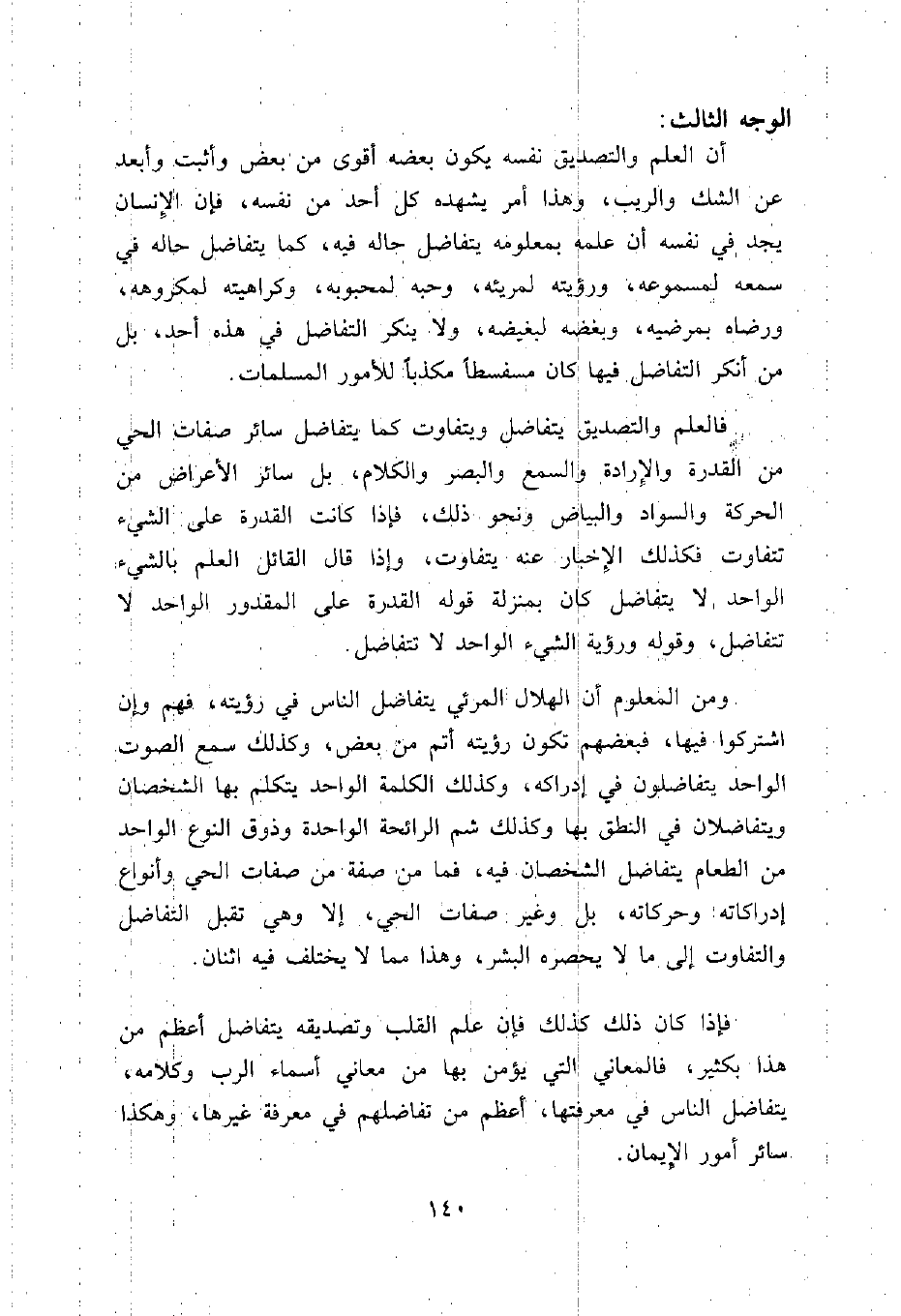 فالعلم والتصديق يتفاضل ويتفاوت كما يتفاضل سائر صفات الحي من القدرة والإرادة والسمع والبصر والكلام، بل سائر الأعراض من الحركة والسواد والبياض ونحو ذلك، فإذا كانت القدرة على الشيء تتفاوت فكذلك الإخبار عنه يتفاوت، وإذا قال القائل العلم بالشيء الواحد لا يتفاضل كان بمنزلة قوله القدرة على المقدور الواحد لا تتفاضل، وقوله ورؤية الشيء الواحد لا تتفاضل.