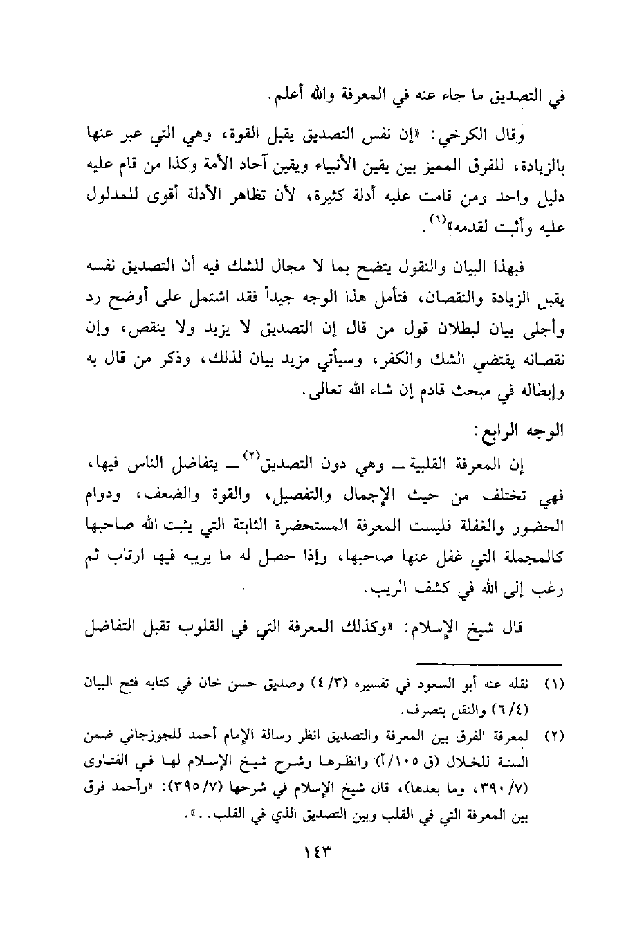 فبهذا البيان والنقول يتضح بما لا مجال للشك في، أن التصديق نفسه يقبل الزيادة والنقصان، فتأمل هذا الوجه جيداً فقد اشتمل على أوضح رد وأجلى بيان لبطلان قول من قال إن التصديق لا يزيد ولا ينقص، وإن نقصانه يقتضي الشك والكفر، وسيأتي مزيد بيان لذلك، وذكر من قال به وإبطاله في مبحث قادم إن شاء الله تعالى.