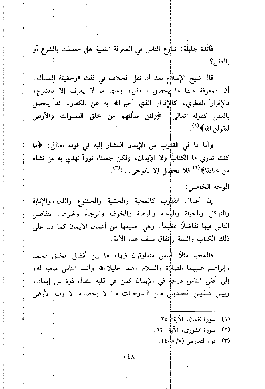 وأما ما في القلوب من الإيمان المشار إليه في قوله تعالى: {مَا كُنْتَ تَدْرِي مَا الْكِتَابُ وَلا الأِيمَانُ وَلَكِنْ جَعَلْنَاهُ نُوراً نَهْدِي بِهِ مَنْ نَشَاءُ مِنْ عِبَادِنَا} 2 فلا يحصل إلا بالوحي.. "3.
