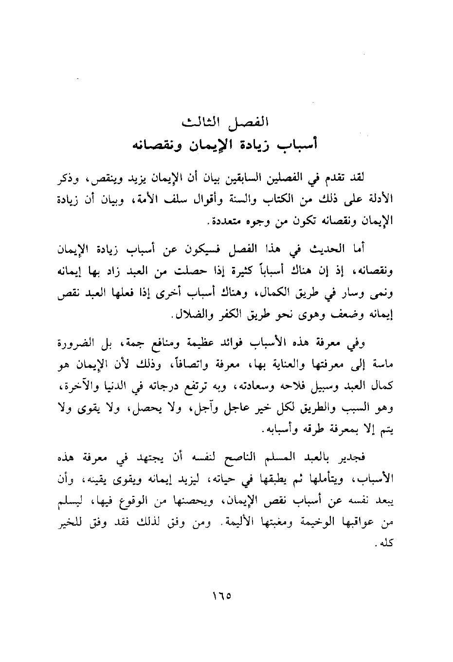 أما الحديث في هذا الفصل فسيكون عن أسباب زيادة الإيمان ونقصانه، إذ إن هناك أسباباً كثيرة إذا حصلت من العبد زاد بها إيمانه ونمى وسار في طريق الكمال، وهناك أسباب أخرى إذا فعلها العبد نقص إيمانه وضعف وهوى نحو طريق الكفر والضلال.