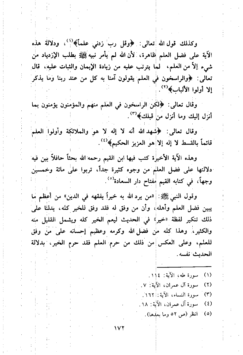 وهذه الآية الأخيرة كتب فيها ابن القيم رحمه الله بحثاً حافلاً بين فيه دلالتها على فضل العلم من وجوه كثيرة جداً، تربوا على مائة وخمسين وجهاً، في كتابه القيم مفتاح دار السعادة 5.