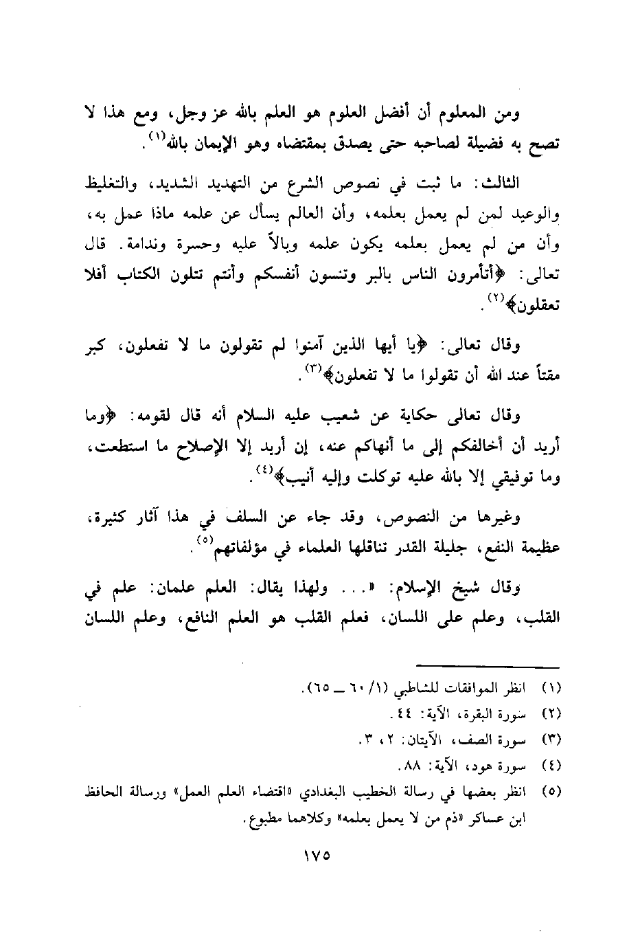 الثالث: ما ثبت في نصوص الشرع من التهديد الشديد، والتغليظ والوعيد لمن لم يعمل بعلمه، وأن العالم يسأل عن علمه ماذا عمل به، وأن من لم يعمل بعلمه يكون علمه وبالاً عليه وحسرة وندامة. قال تعالى: {أَتَأْمُرُونَ النَّاسَ بِالْبِرِّ وَتَنْسَوْنَ أَنْفُسَكُمْ وَأَنْتُمْ تَتْلُونَ الْكِتَابَ أَفَلا تَعْقِلُونَ} 2.
