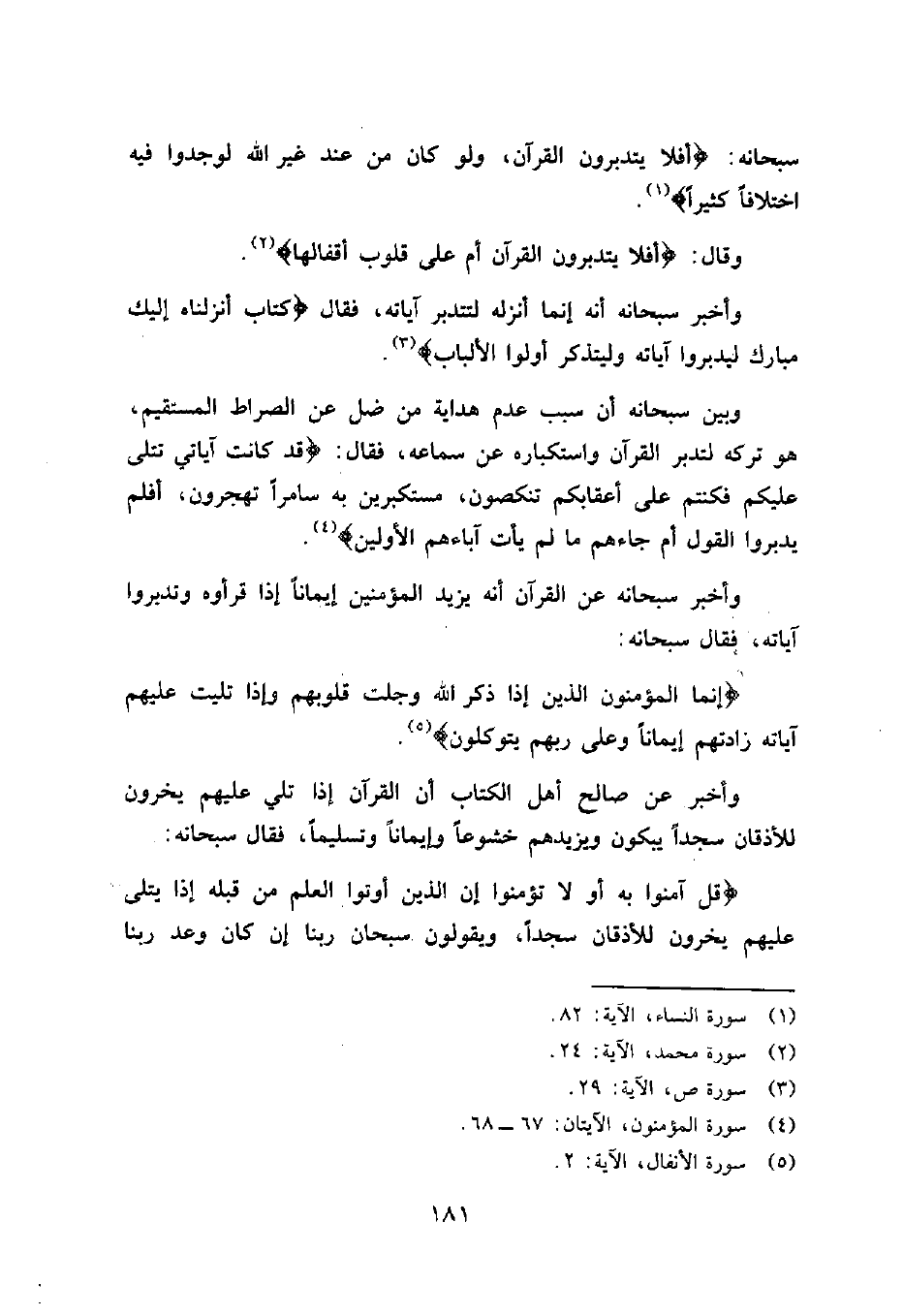 سبحانه: {أَفَلا يَتَدَبَّرُونَ الْقُرْآنَ وَلَوْ كَانَ مِنْ عِنْدِ غَيْرِ اللَّهِ لَوَجَدُوا فِيهِ اخْتِلافاً كَثِيراً} 1.