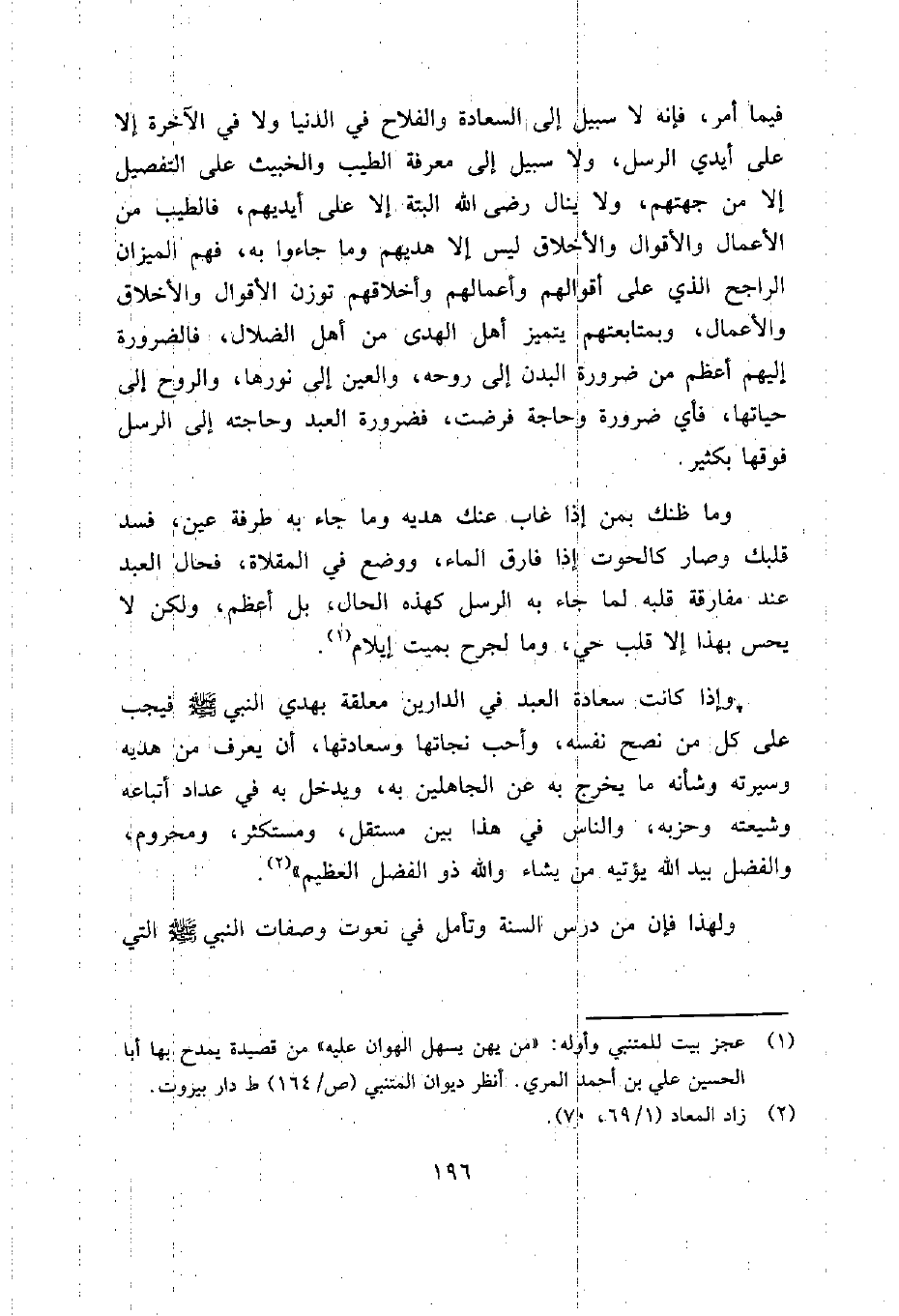 وإذا كانت سعادة العبد في الدارين معلقة بهدي النبي صلى الله عليه وسلم فيجب على كل من نصح نفسه، وأحب نجاتها وسعادتها، أن يعرف من هديه وسيرته وشأنه ما يخرج به عن الجاهلين به، ويدخل به في عداد أتباعه وشيعته وحزبه، والناس في هذا بين مستقل، ومستكثر، ومحروم، والفضل بيد الله يؤتيه من يشاء والله ذو الفضل العظيم"2.