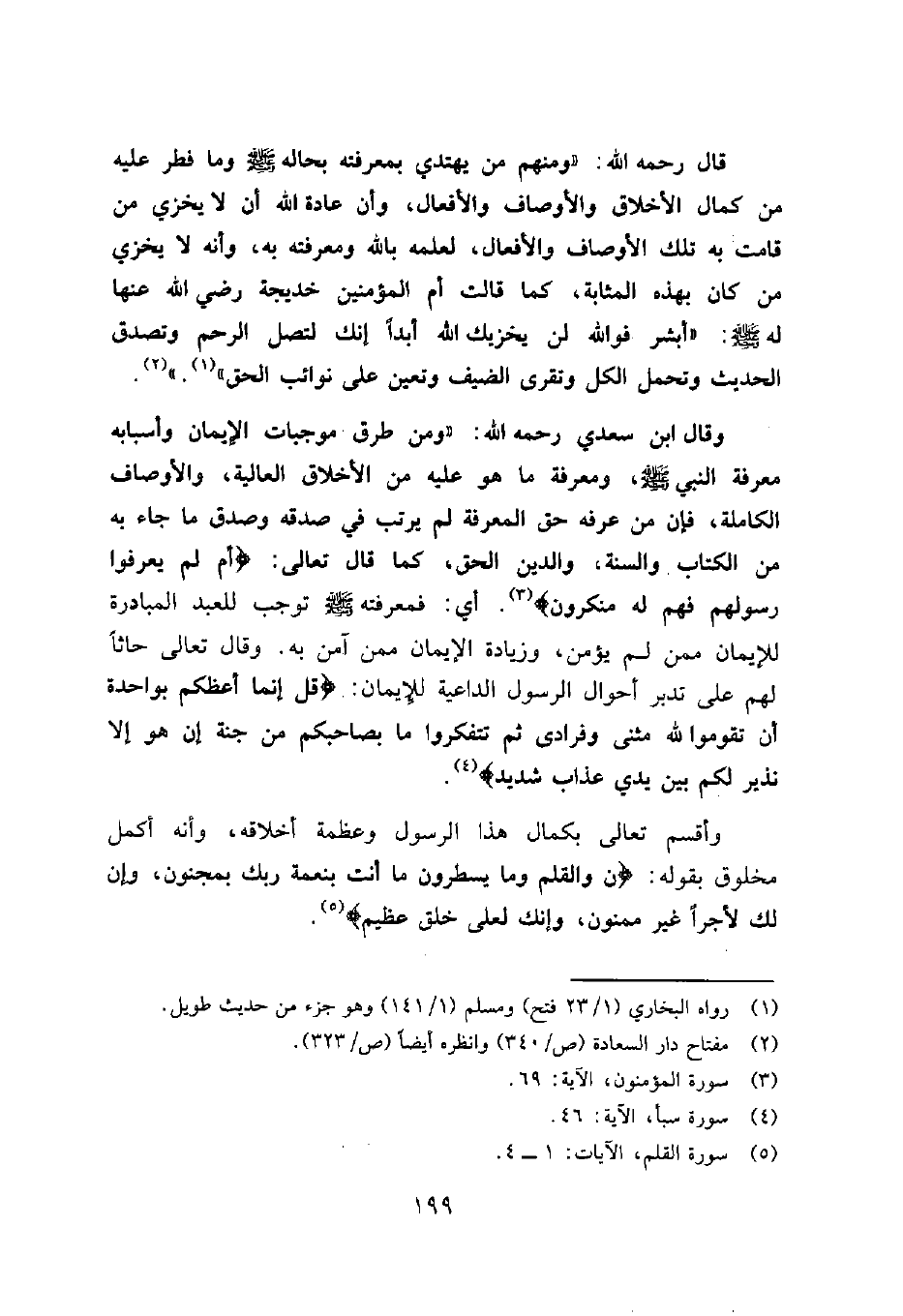 وقال ابن سعدي رحمه الله:"ومن طرق موجبات الإيمان وأسبابه معرفة النبي صلى الله عليه وسلم، ومعرفة ما هو عليه من الأخلاق العالية، والأوصاف الكاملة، فإن من عرفه حق المعرفة لم يرتب في صدقه وصدق ما جاء به من الكتاب والسنة، والدين الحق، كما قال تعالى: {أَمْ لَمْ يَعْرِفُوا رَسُولَهُمْ فَهُمْ لَهُ مُنْكِرُونَ} 3، أي: فمعرفته صلى الله عليه وسلم توجب للعبد المبادرة للإيمان ممن لم يؤمن، وزيادة الإيمان ممن آمن به.