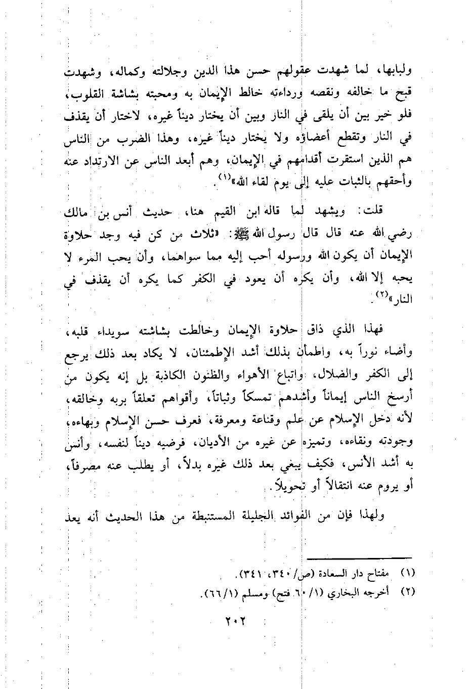 قلت: ويشهد لما قاله ابن القيم هنا، حديث أنس بن مالك رضي الله عنه قال قال رسول الله صلى الله عليه وسلم:"ثلاث من كن فيه وجد حلاوة الإيمان أن يكون الله ورسوله أحب إليه مما سواهما، وأن يحب المرء لا يحبه إلا الله، وأن يكره أن يعود في الكفر كما يكره أن يقذف في النار"2.