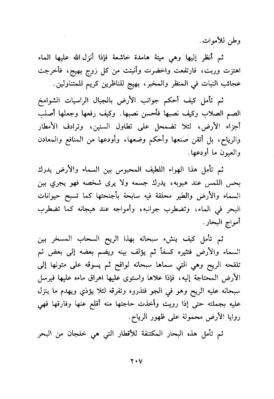 ثم تأمل هذا الهواء اللطيف المحبوس بين السماء والأرض يدرك بحس اللمس عند هبوبه، يدرك جسمه ولا يرى شخصه فهو يجري بين السماء والأرض والطير محلقة فيه سابحة بأجنحتها كما تسبح حيوانات البحر في الماء، وتضطرب جوانبه، وأمواجه عند هيجانه كما تضطرب أمواج البحار.