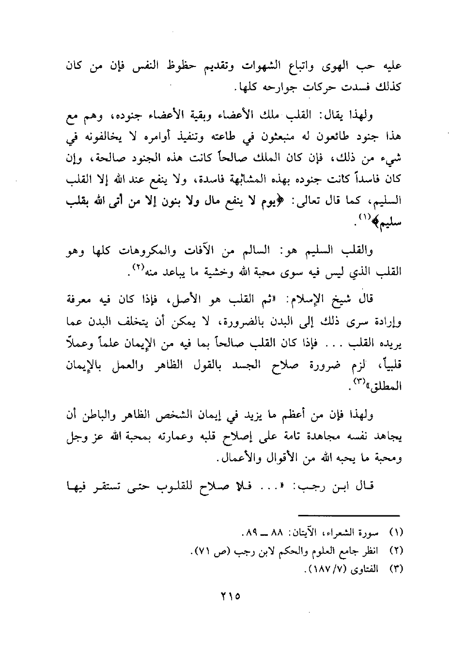 ولهذا يقال: القلب ملك الأعضاء وبقية الأعضاء جنوده، وهم مع هذا جنود طائعون له منبعثون في طاعته وتنفيذ أوامره لا يخالفونه في شيء من ذلك، فإن كان الملك صالحاً كانت هذه الجنود صالحة، وإن كان فاسداً كانت جنوده بهذه المشابهة فاسدة، ولا ينفع عند الله إلا القلب السليم، كما قال تعالى: {يَوْمَ لا يَنْفَعُ مَالٌ وَلا بَنُونَ * إِلا مَنْ أَتَى اللَّهَ بِقَلْبٍ سَلِيمٍ} 1.
