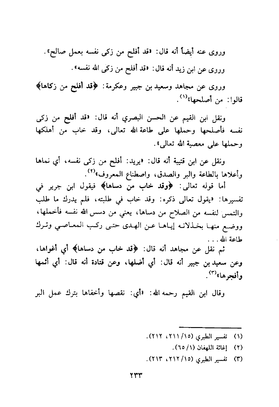 ونقل ابن القيم عن الحسن البصري أنه قال:"قد أفلح من زكى نفسه فأصلحها وحملها على طاعة الله تعالى، وقد خاب من أهلكها وحملها على معصية الله تعالى".